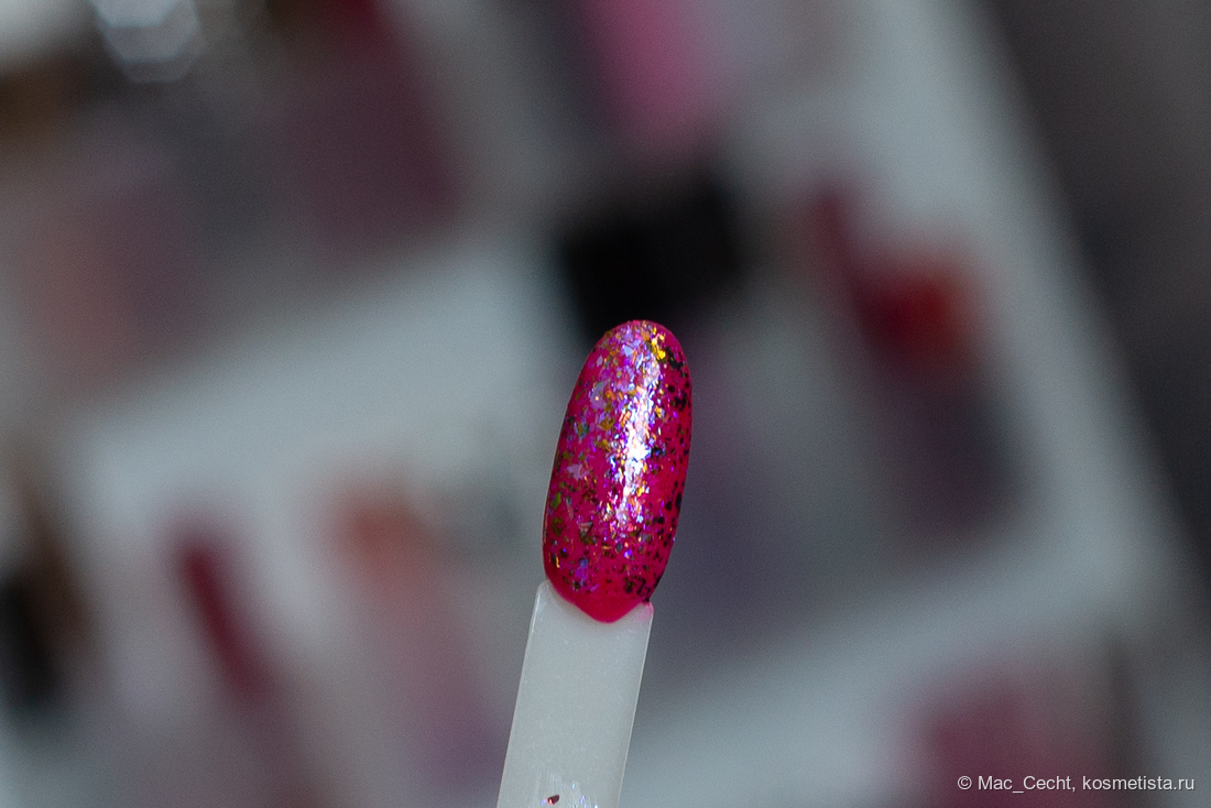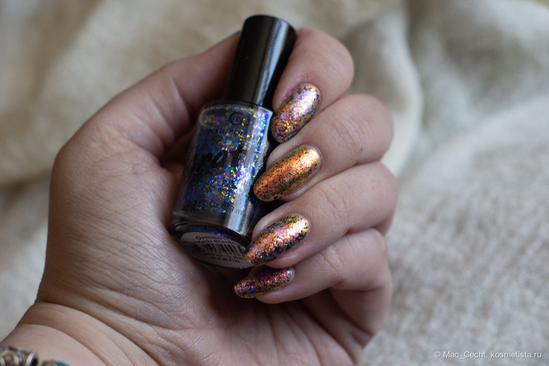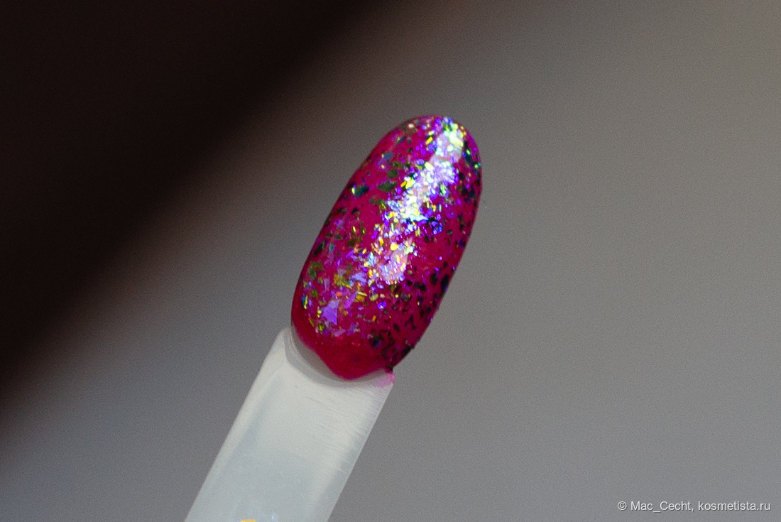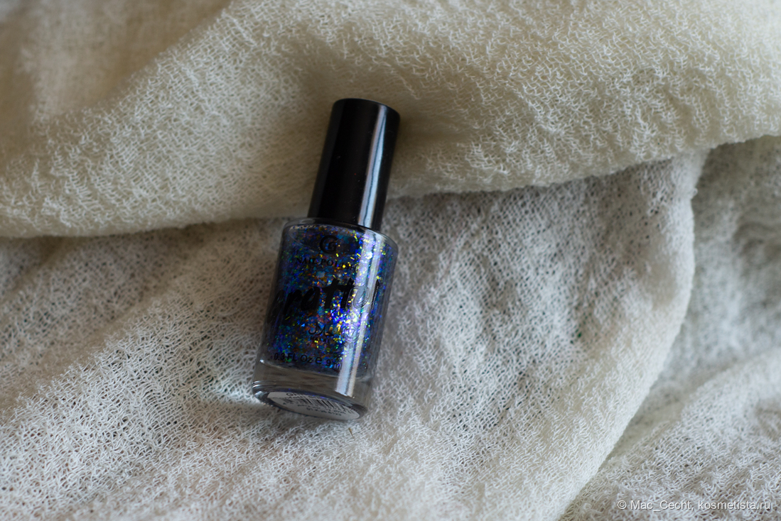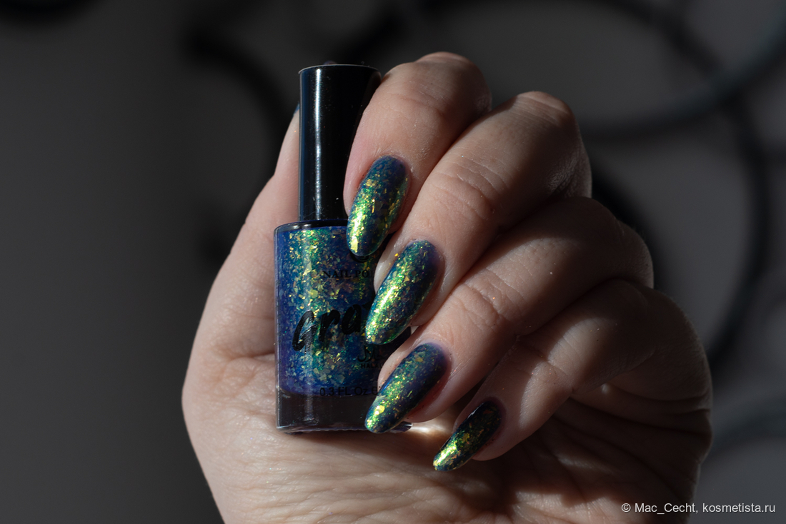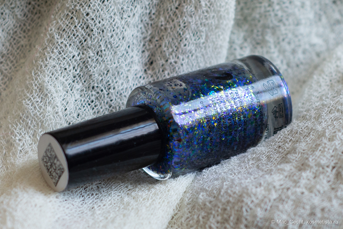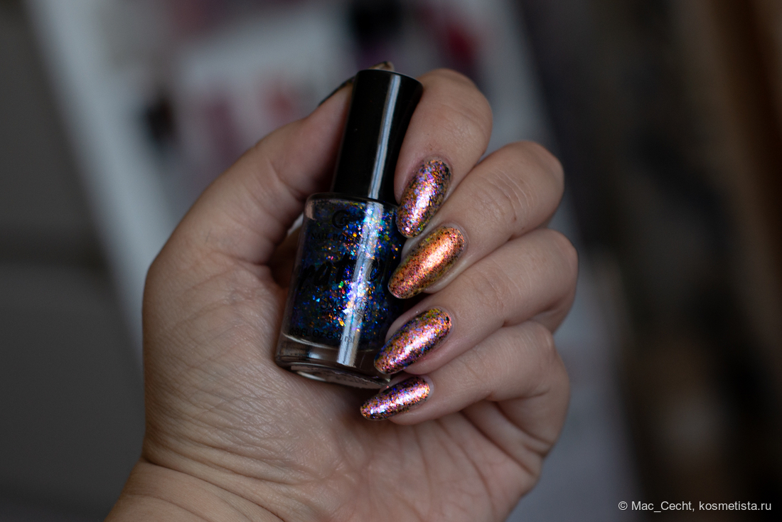 Марка описывает топ как «прозрачный с синей слюдой и мультихромной (медно-золото-зелёной) поталью». Топ действительно прозрачный, и в один слой добавит только немного разноцветных искр.