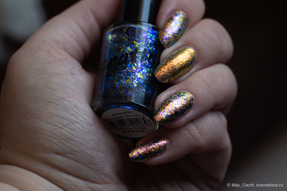 В общем, если нанести Confetti Stardrop в один слой — это будет легкая украшалочка. Слюда поблескивает синим, переливается зелото-зеленым, но скромненько так. С намеком на айнанэ и возможный изюм.
