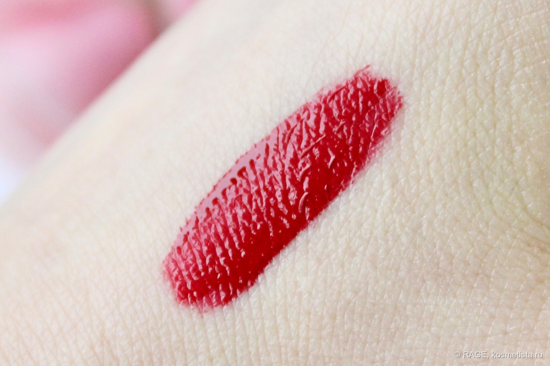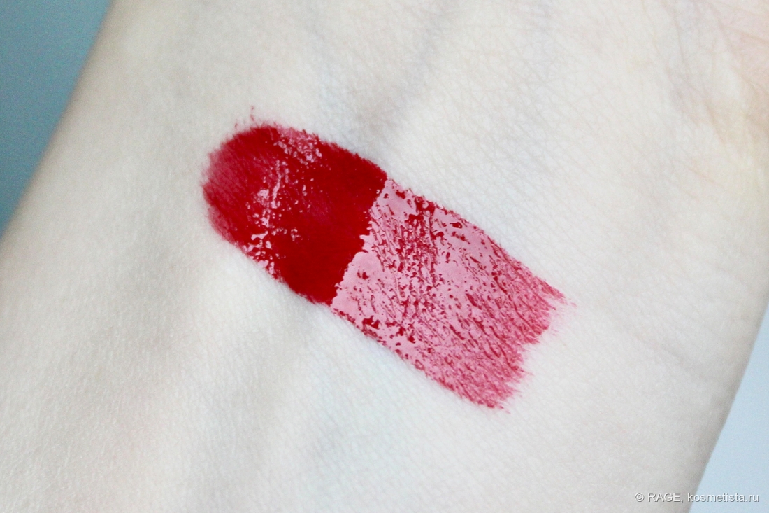 Формула однородная, жидкая, но не растекающаяся. Отдушка приятная, с нотками граната, на губах ощущается минут 10.