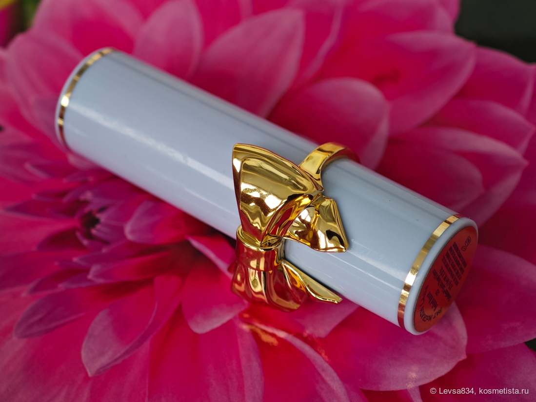 На пояске футляра заметен крупный золотой бант — если привыкнуть, то эта деталь не мешает и выглядит мило. Помните куклу-неваляшку? На неё фулляр не похож, конечно, но принцип такой же, помада-неукаташка, безопасно, удобно, практично.