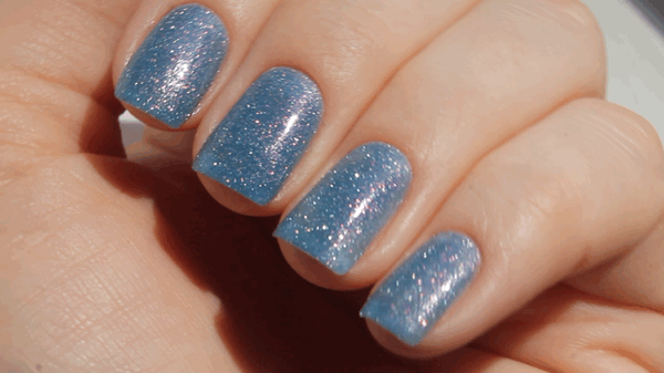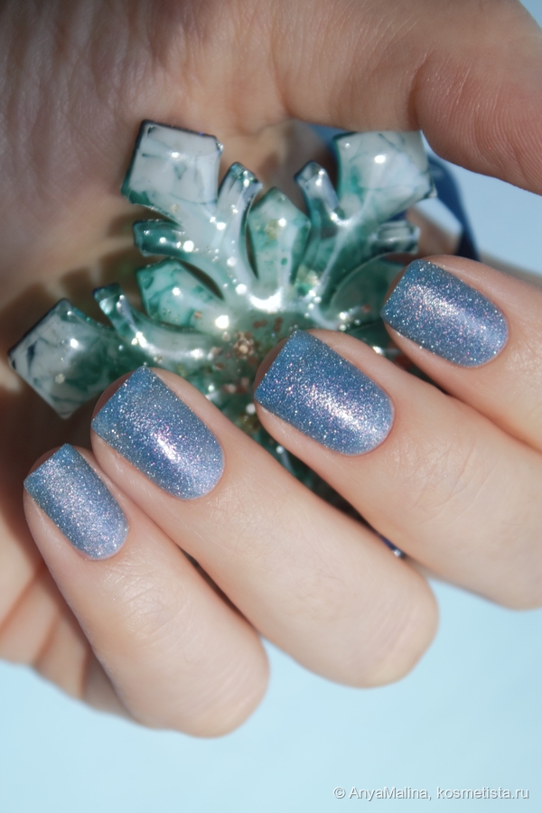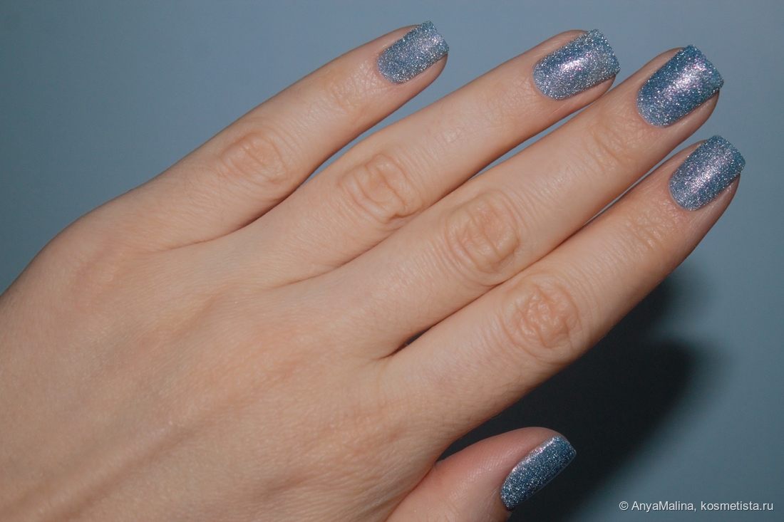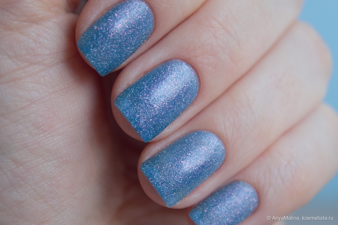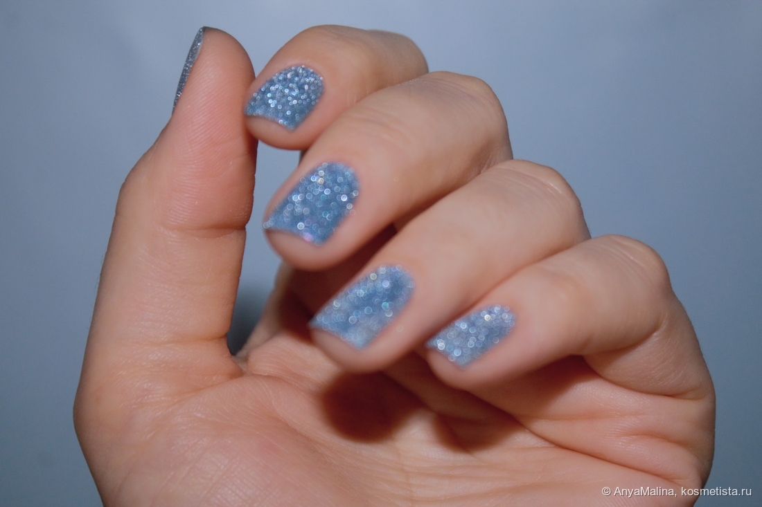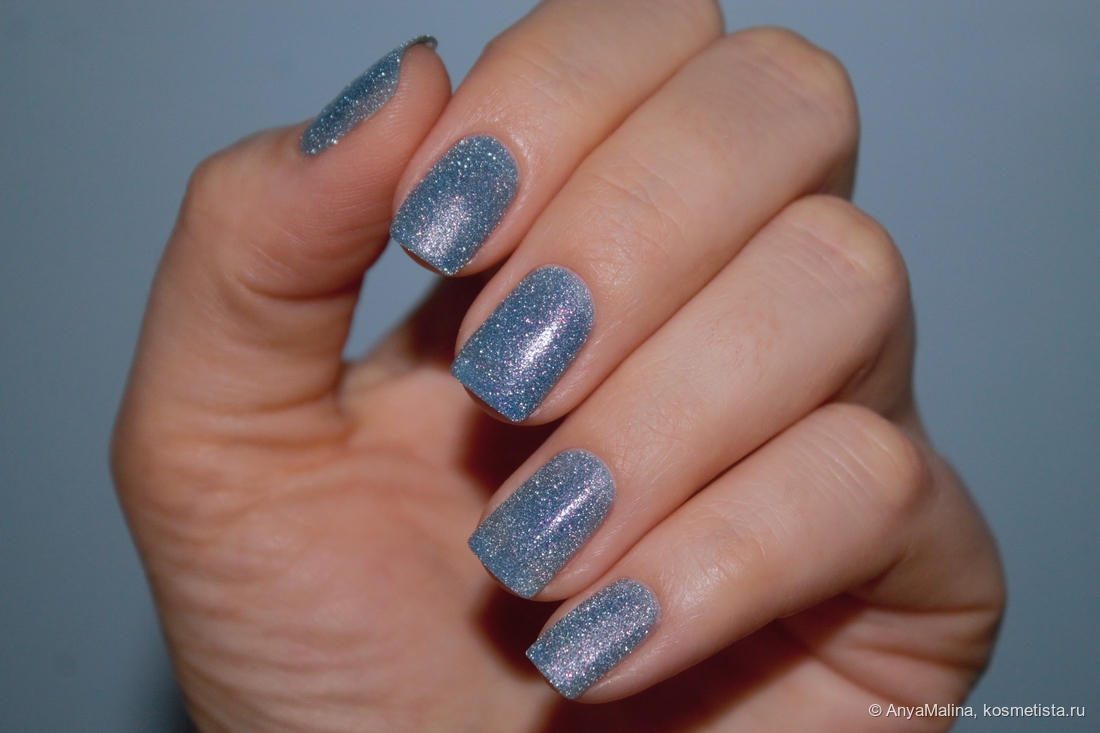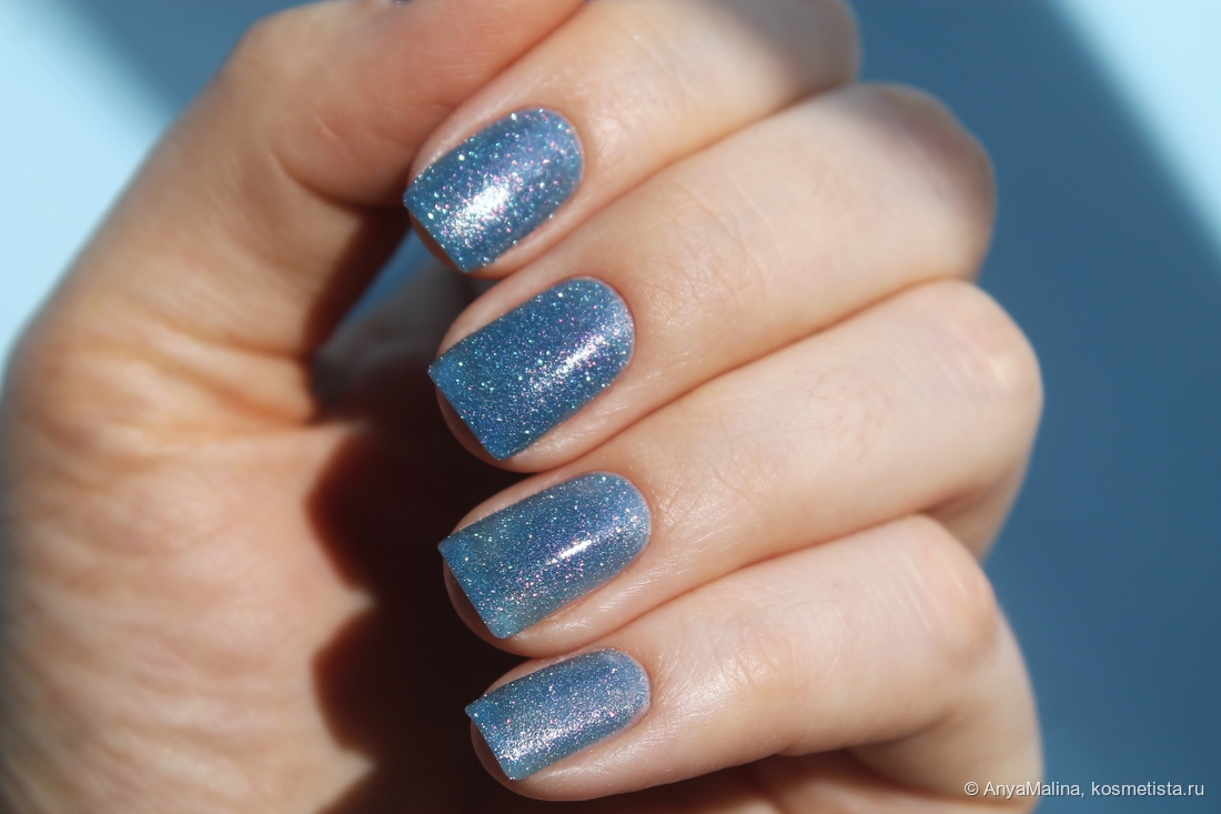 При дневном освещении лак выглядит красиво, но не так эффектно, как на солнце или со вспышкой. Оттенок серо-синий, куча не крупных сиящих частиц в серебре и чуть в розовом. Покрытие тут в пару слоев без базы и без топа, едва просвечивает свободный край, хорошо заметна песочная, совершенно комфортная текстура лака.