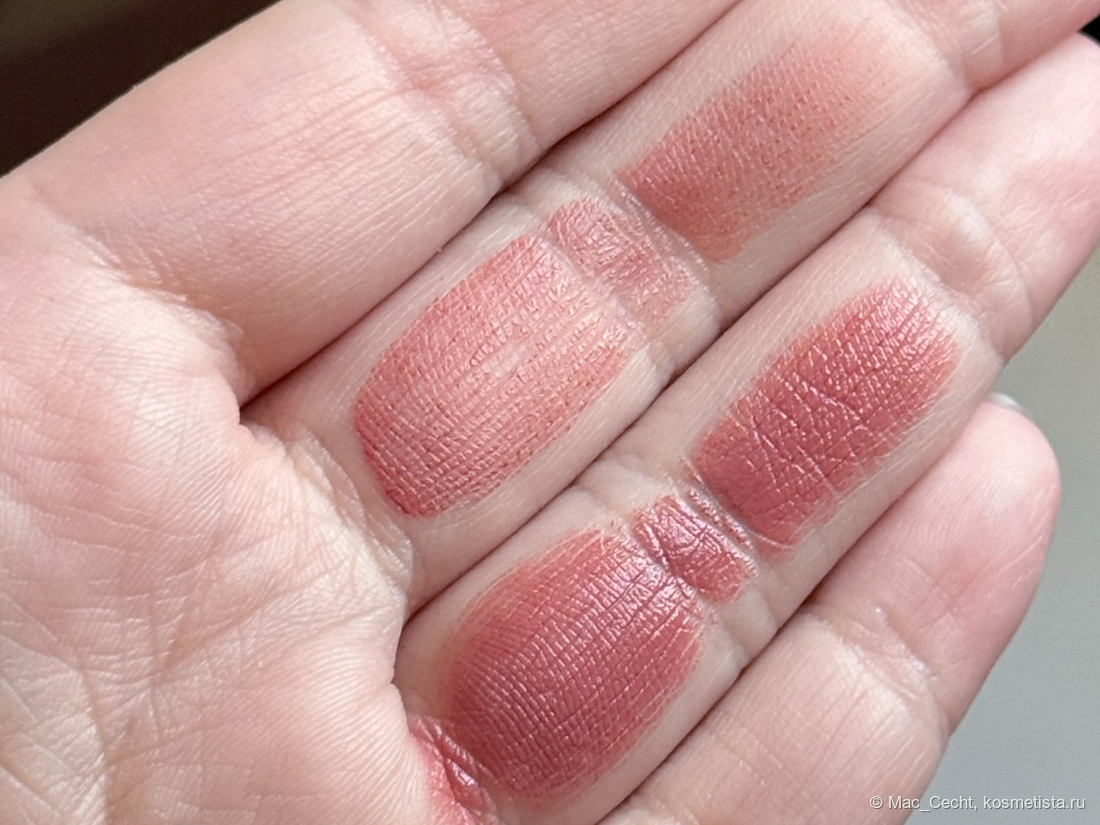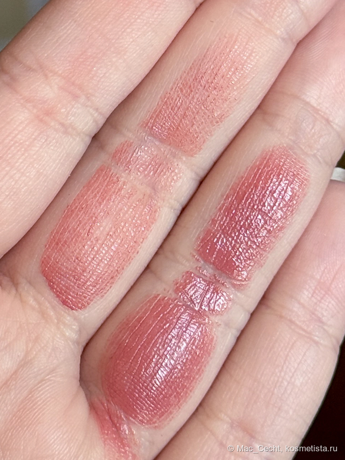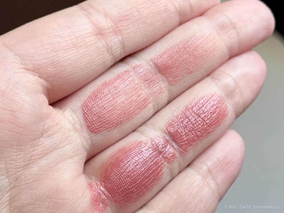 Rosebud — для меня это теплый розовый с краснинкой и коричневинкой. Хотела бы я сказать, что она именно на мне теплеет, но теплый и стик, и свотчи.
