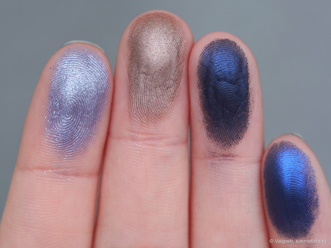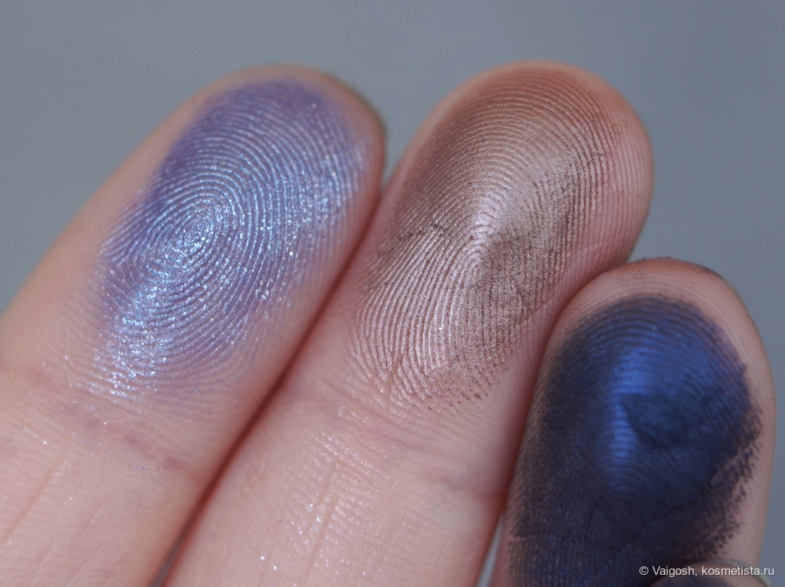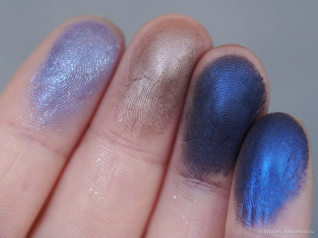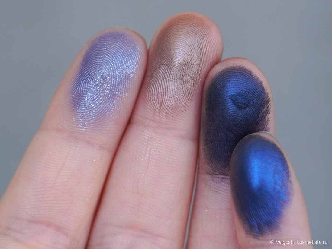 Так вот, про тени-то. Матовых оттенков тут нет совсем — только голубой спаркл да три сатина разной степени сверкучести. Мне, в принципе, и так нормально: весь олдскульный люкс на том стоял, для меня сияющая складка вещь привычная.