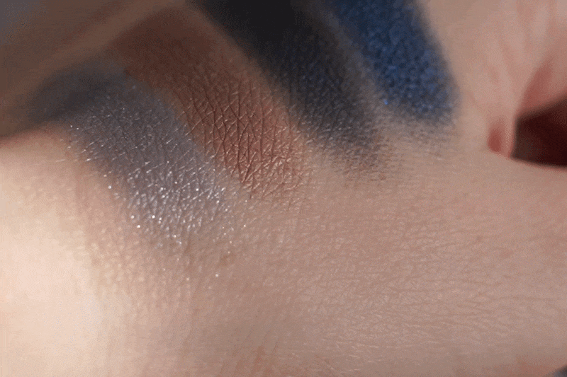 Тауп — в растушевке, темно-синий — в складке и внешнем уголке, голубой — во внутреннем, на подвижном веке — ярко-синий то ли сатин, то ли металлик — не знаю даже, как его назвать, сами думайте: