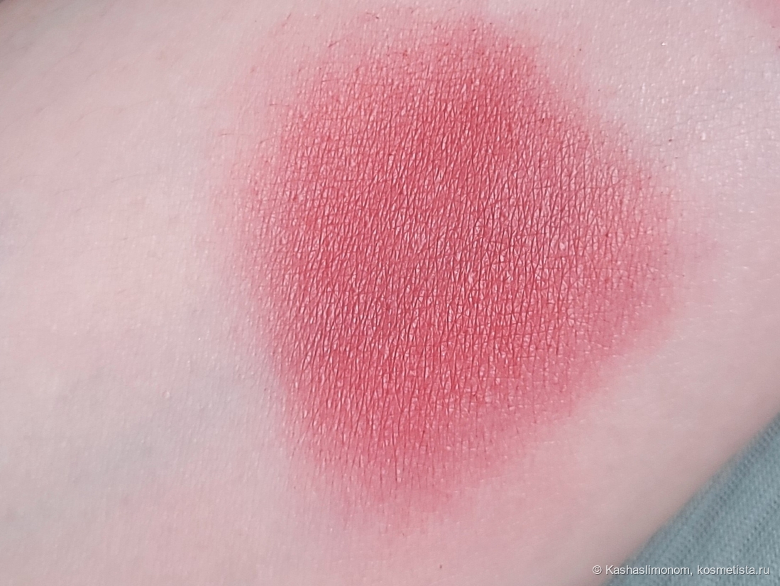 Пигмент обильно набирается на палец. Но с него нанести румяна на лицо нормально не получится — будет пятнить. А вот на кисть набирается слабо, но аккуратно. Пятен точно не будет, и переборщить не удастся. Вроде это даже самый яркий оттенок в палитре линейки. Если он такой деликатный, то как выглядят на лице другие? А там есть коралловые, персиковые… Их вообще видно?