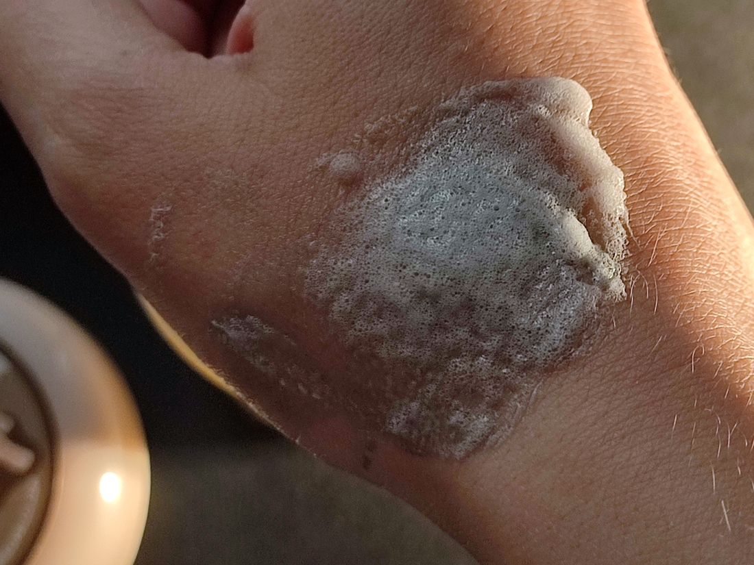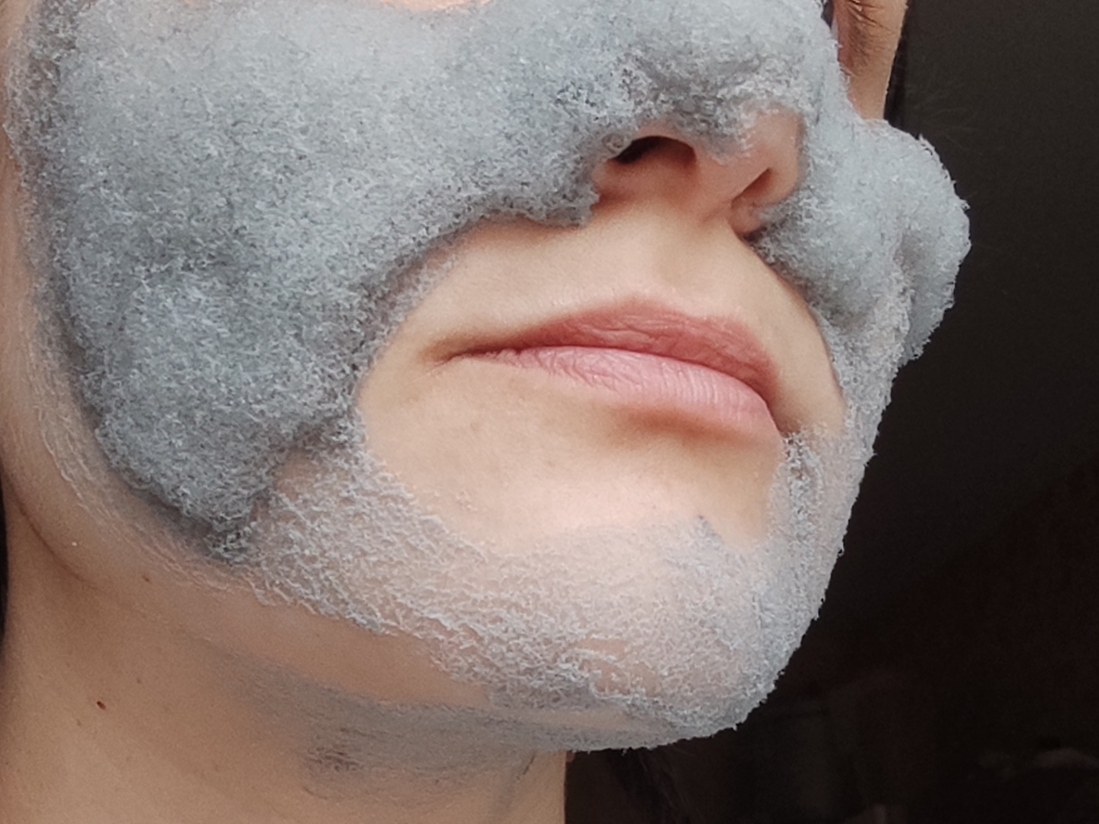 На лице пузыриться начинает чуть погодя: есть несколько секунд, чтоб нанести маску в интенсивном режиме. По коже она распределяется легко. Мне удобнее всего зачерпнуть нужное количество лопаткой, бахнуть содержимое на щеку и дальше размазать все это дело по лицу руками, делая вид, что я по-быстрому маскируюсь от Хищника(того, что из старого фильма про Хищника). Разницу между нанесением на влажную и сухую кожу я особо не заметила.