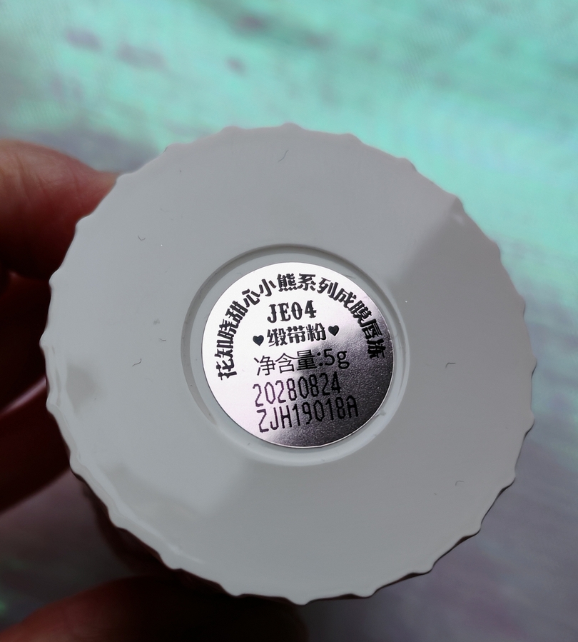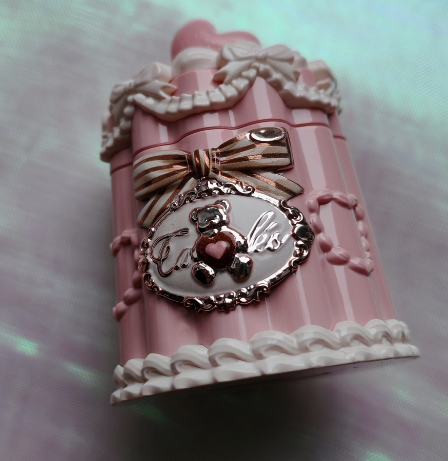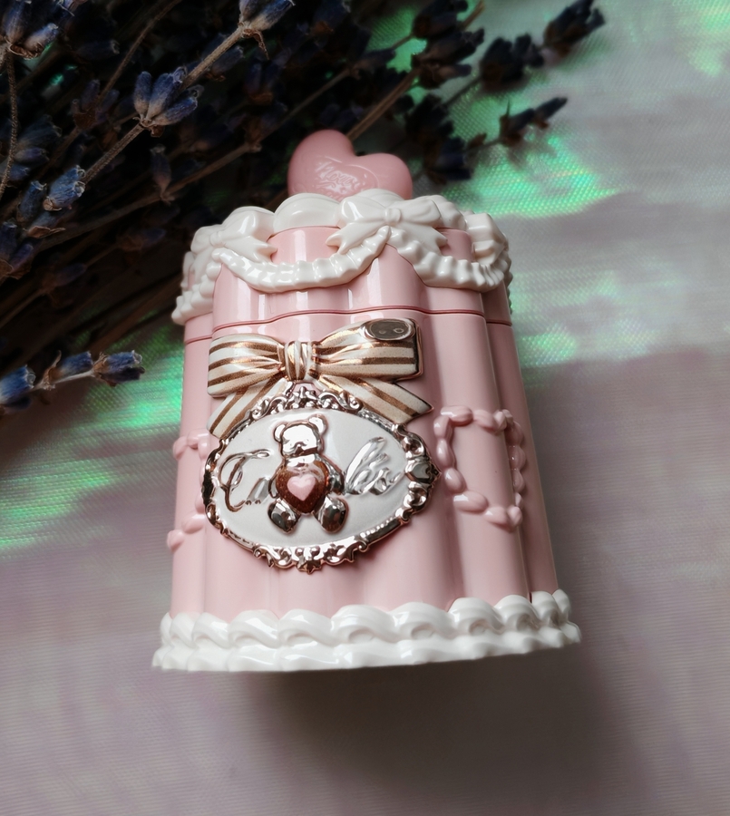 Оформление у баночки очень милое. Розовый увесистый тортик с белым украшением и вставкой с мишкой.
