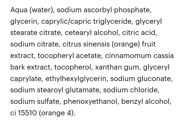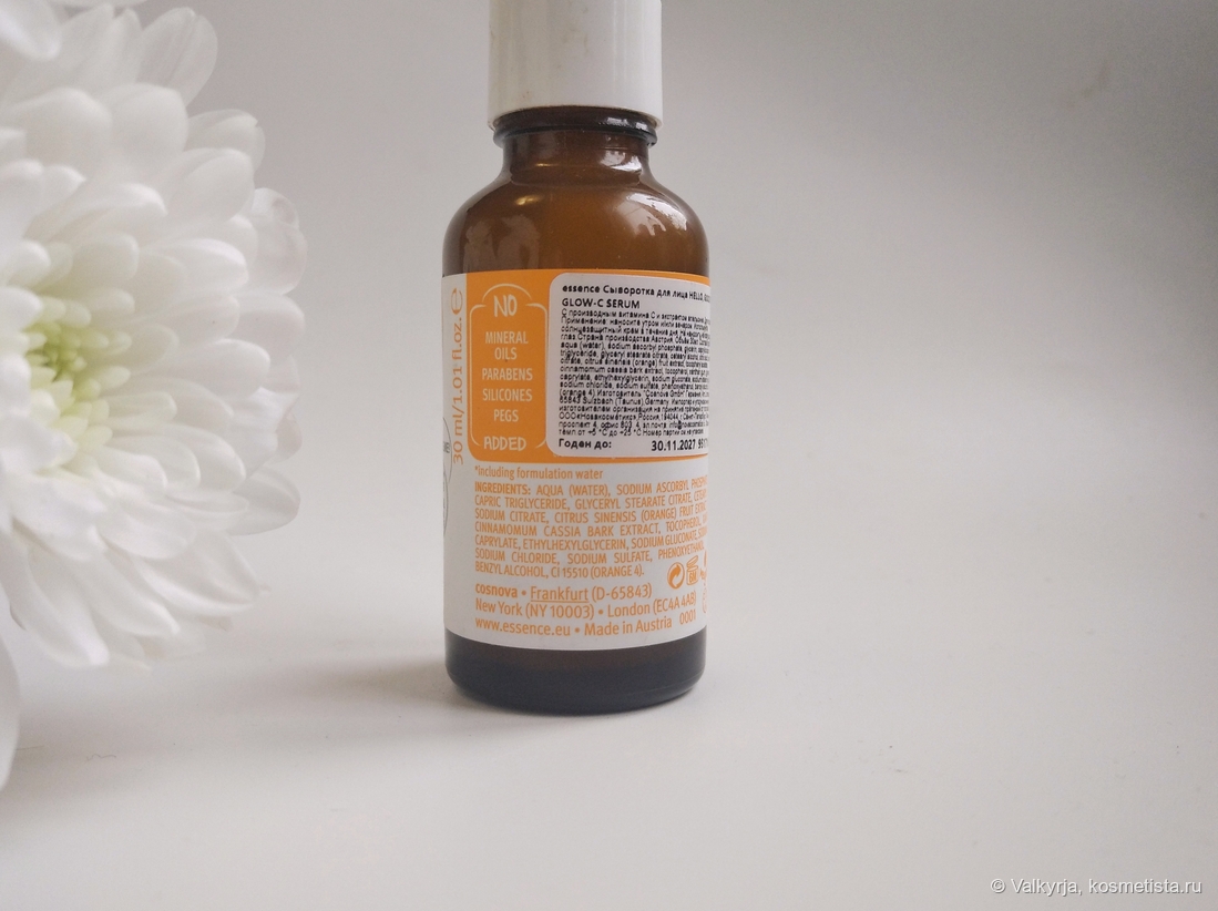 К составу в момент покупки не присматривалась, однако… Купила в момент «срочно что-то нужно, как раз сыворотка подходит к концу». Потом дома мельком глянула, что в составе есть экстракт апельсина и в активе — стабильная форма витамина С.