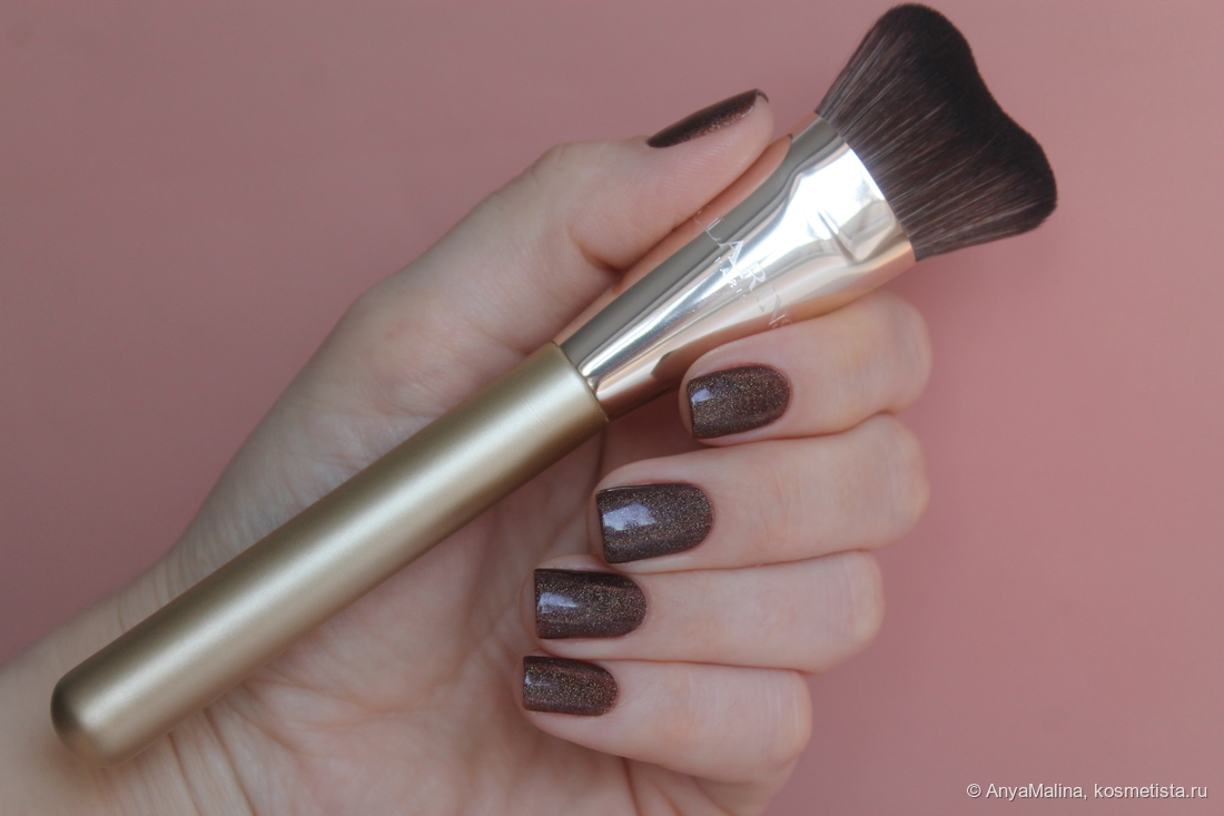 Кисть нежная, но плотно набитая, ворс совершенно не колючий. За все время использования ни один синтетический волосок эту трендовую кисть не покинул. Держу кулачки, чтобы и дальше так оно и было.