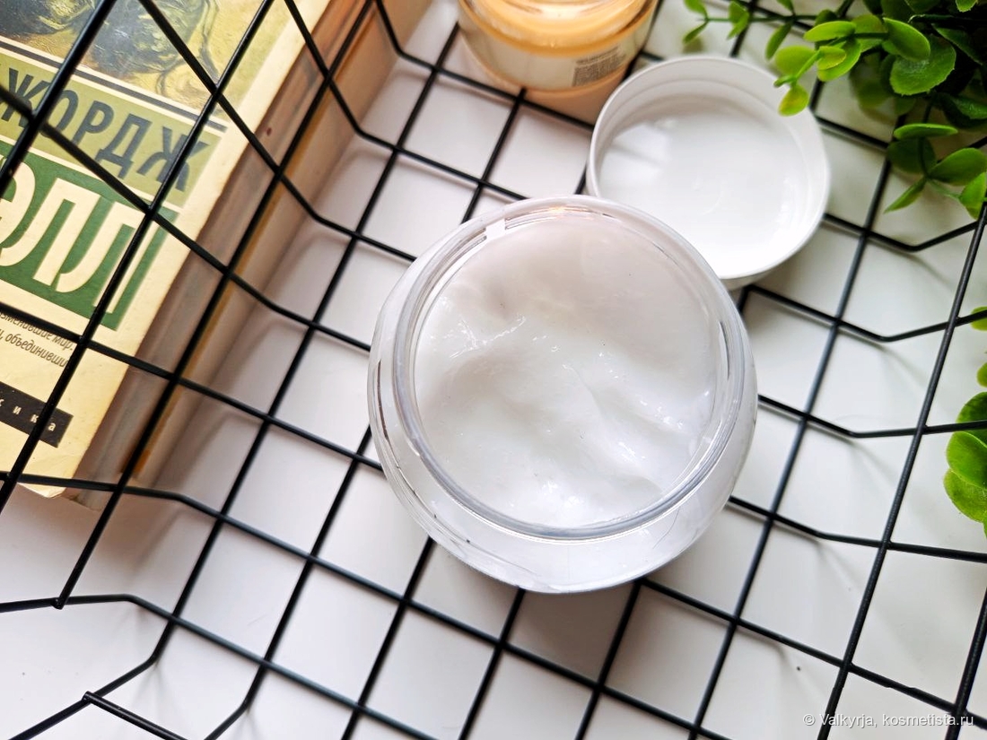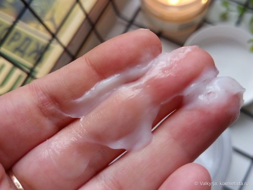 Текстура — как лёгкий крем, среднестатистический бальзам для волос. Особой силиконистости или маслянистости не ощущаю, но на волосах она «сидит» отлично. И эмульгируется при расчесывании на влажных волосах (кудрявые поймут), и не стекает с волос. И смывается без проблем.
