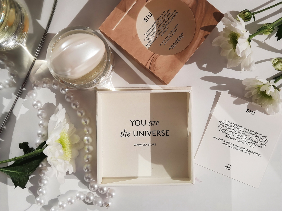 С нидерландским брендом Siu я познакомилась в 2025, он привлёк моё внимание особой подачей продуктов и своей философией. Siu предлагает исключительное качество благодаря передовым технологиям производства, а каждый элемент подчёркивает элегантность и изысканность. Бутылочки из прочного стекла, фурнитура и бумага сделаны в Италии, натуральный жемчуг внутри флакона — всё передаёт эстетику и философию бренда в каждой детали. И, прикоснувшись к флакону, можно заглянуть в свою вселенную!
