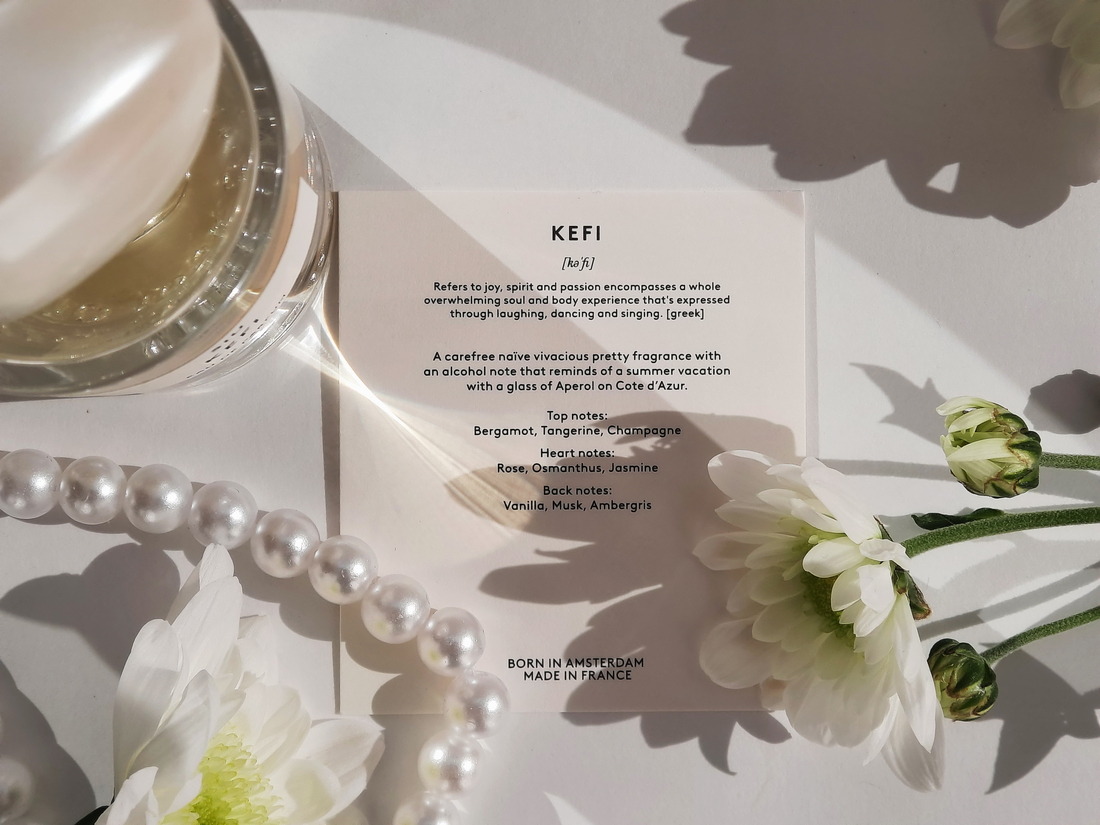 Исходя из описания и нот ольфакторной пирамиды можно узнать, что Kefi — это аромат праздника за счет нот шампанского и цитрусовых. На старте брызжет радостными нотками цитрусовых и игристого вина, придаёт сразу настроение и лёгкость момента. Постепенно аромат становится тёплым и уютным, раскрываясь гармонией. Цветочные ноты придаёт композиции женственности и элегантности. Звучит сердце романтично, легко и нежно. Шлейф с тёплыми и сладкими оттенками, можно различить ваниль, амбра и мускус делают его обволакивающим и мягким.