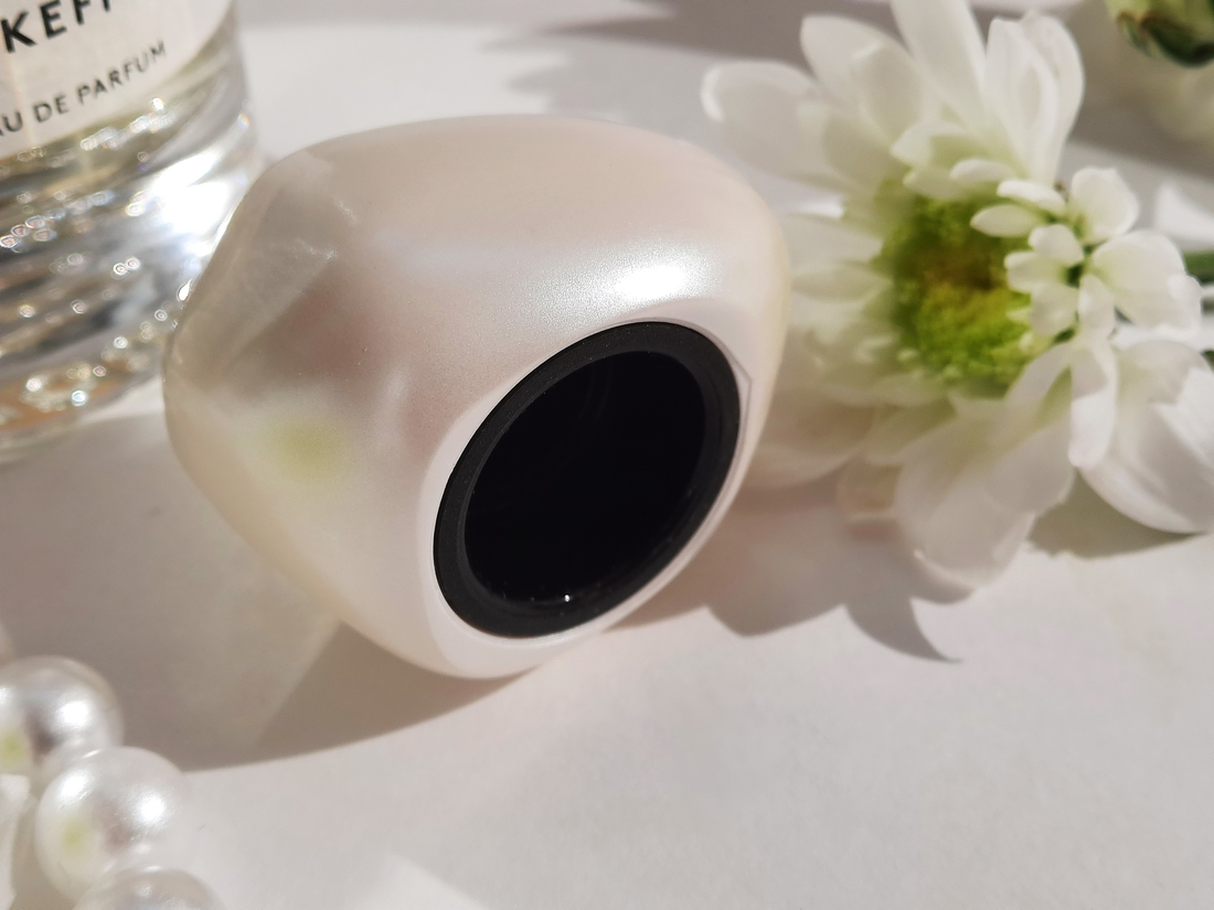 Крышечка флакона дополняет морскую тематику, выполнена в форме перламутровой ракушки. На распылитель крепится за счёт магнита. Внутри крышки тоже располагается символ бренда.