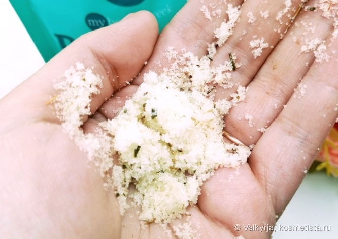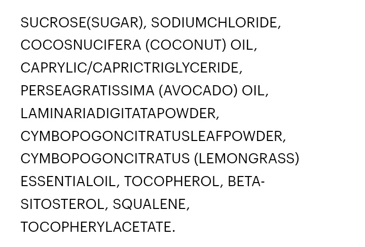 Состав ничем не примечательный, кроме наличия ламинарии в нём. Скраб сахарно-солевой, из-за присутствия кокосового масла, скраб не могла использовать для всего тела. Очень уж оно поры забивает, а у меня с этим есть проблемы.