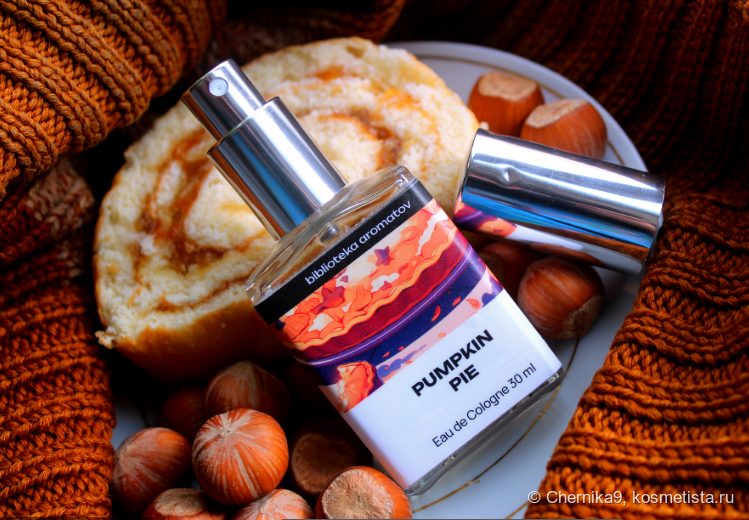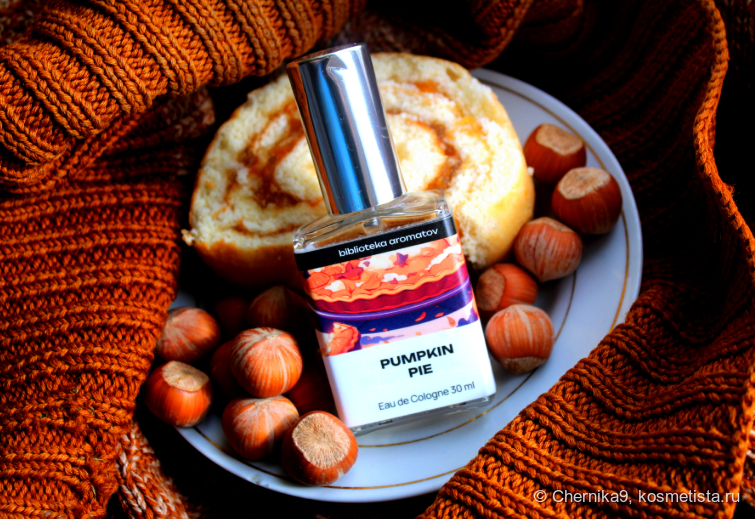 К тыквенному пирогу привёл меня совсем другой аромат от Biblioteka aromatov. У этого бренда в коллекции целых три тыквы: тыквенный латте, тыквенный пирог и тыква в карамели. За последним я охотилась как за последней бутылкой минералки в летний зной, но, вместо тыквы в карамели мне прислали тыквенный пирог. Он не такой настырный, как тыква, его пирамида мягче и состоит всего из трёх нот: