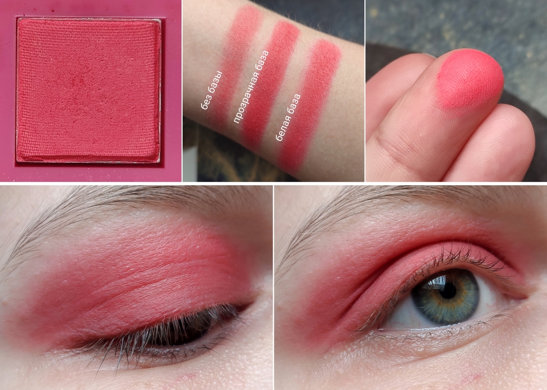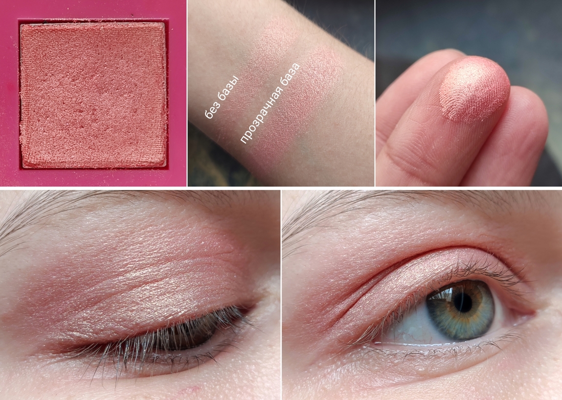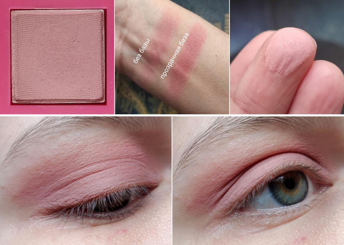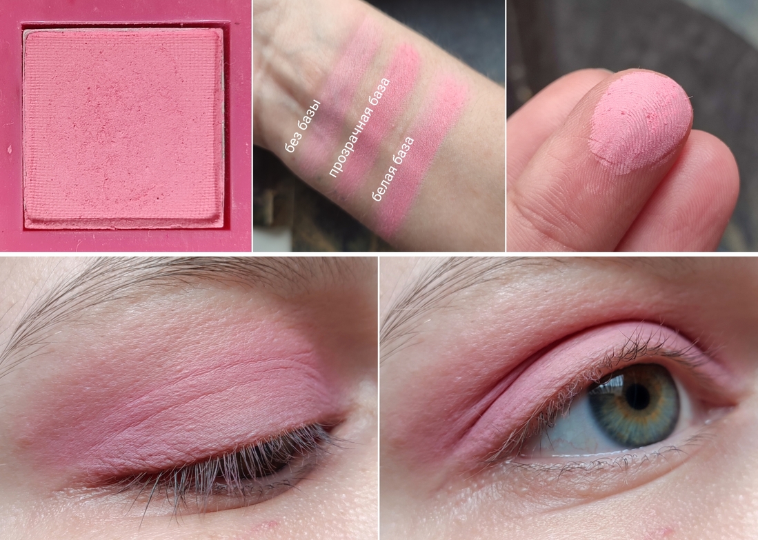 Сладкий леденцово-розовый оттенок. Матовый. Плотно спрессован, шелковистый, но слегка суховат. Сильно пылит. Пигментация у него средняя, но цвет отдает бодро. На базе раскрывается ярко. Барбически ярко.