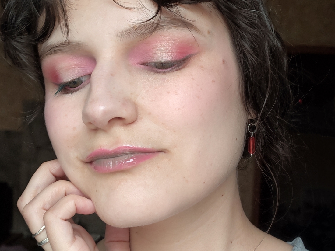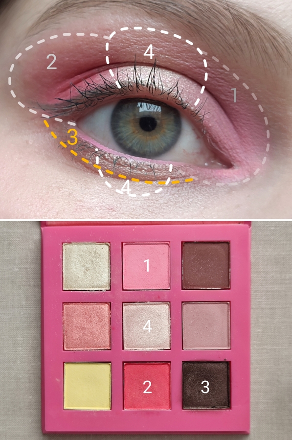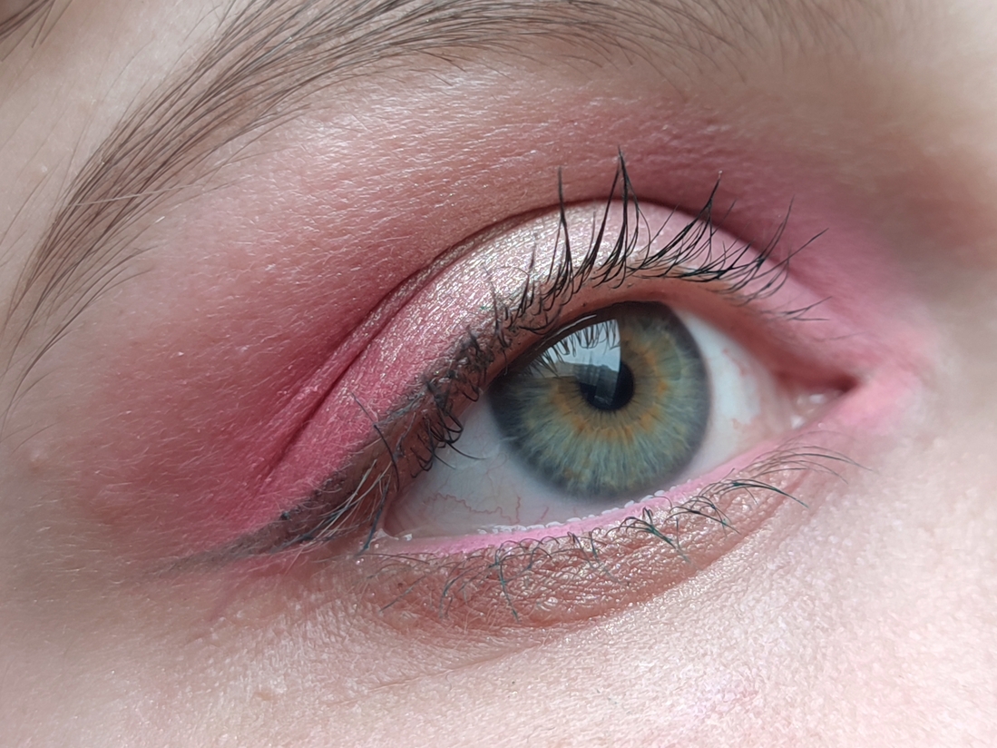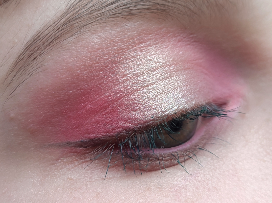Сладкий леденцово-розовый оттенок. Матовый. Плотно спрессован, шелковистый, но слегка суховат. Сильно пылит. Пигментация у него средняя, но цвет отдает бодро. На базе раскрывается ярко. Барбически ярко.