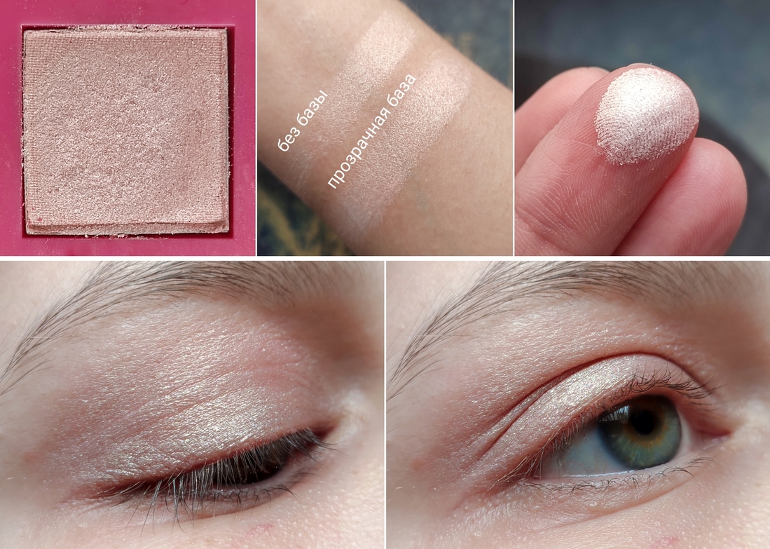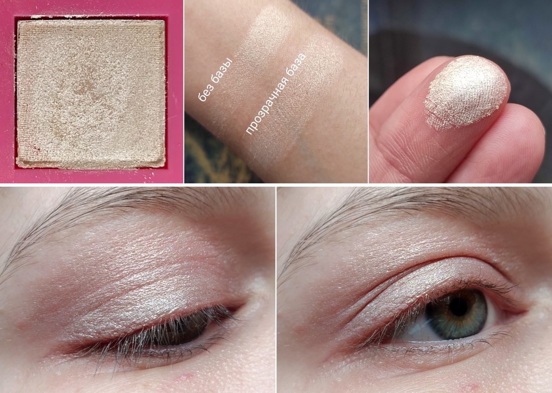 Классический сатин цвета шампанского. Шелковистый, при наборе кистью может пылить. Мне такие оттенки больше нравится наносить пальцем. Цвет выходит чуть плотнее.