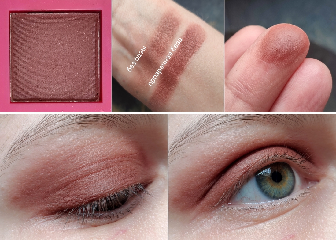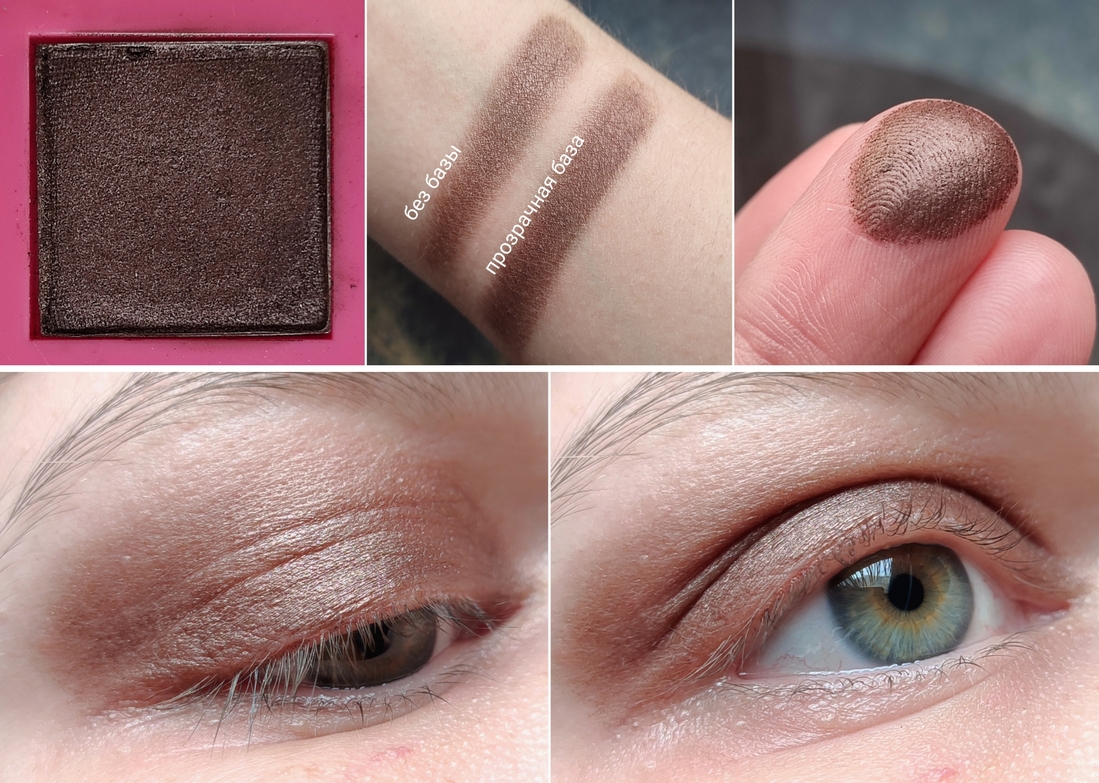 Коричневый матовый. Шелковистый и плотно спрессованный. Цвет отдает неохотно, в тушевке уходит в розовый. Да и так розовит. На нижнем веке делает мои глаза уставшими и болезненными. Оттенок не наслаивается до той глубины, что в рефиле. Пылит не сильно.