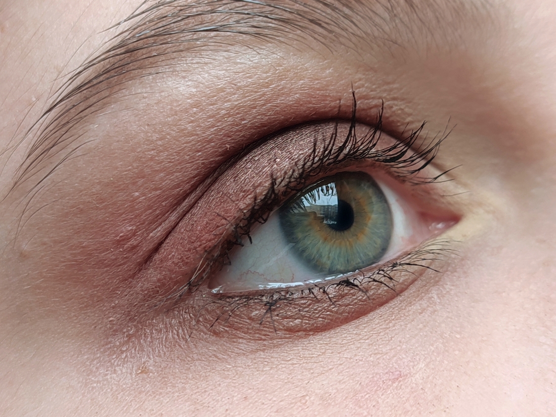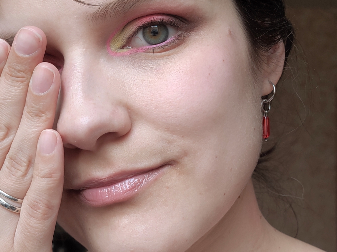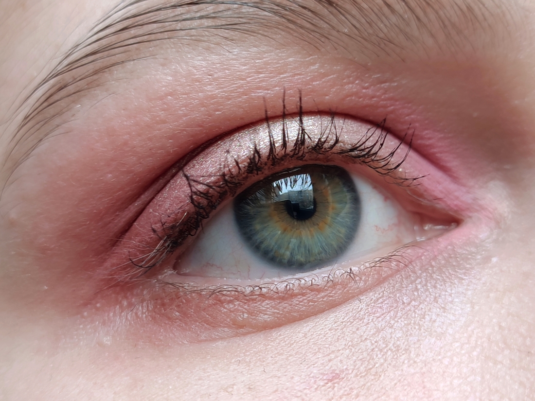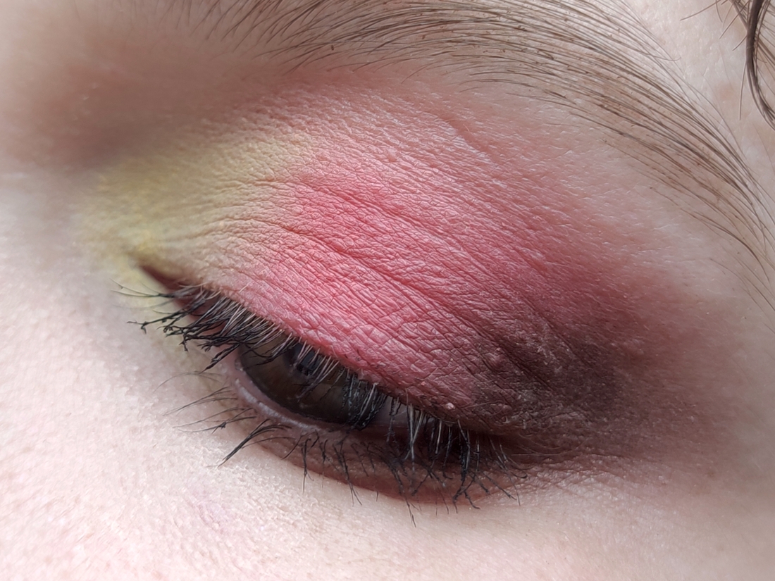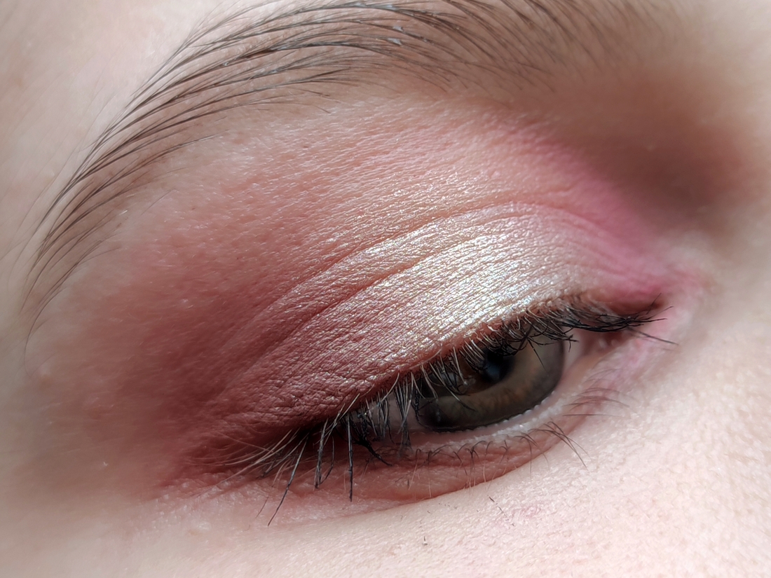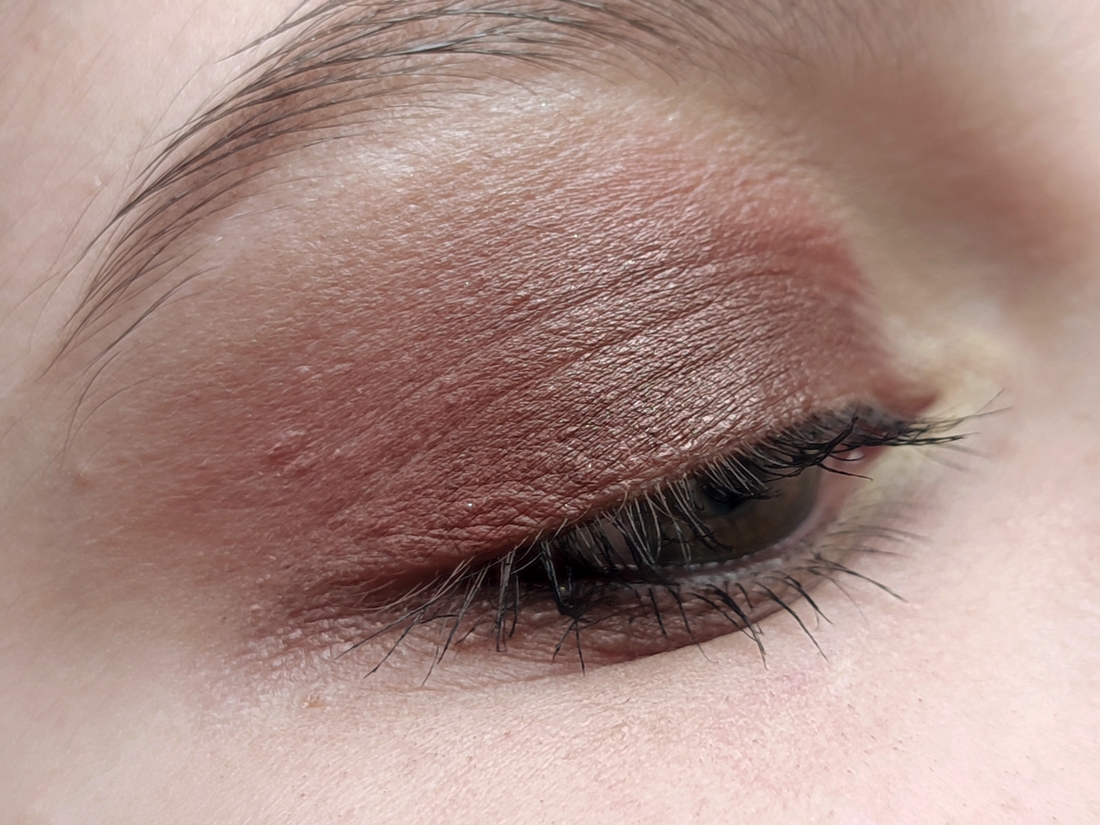 Смущённый теплый розовый. Ирония в том, что оставила я палетку из-за трёх оттенков, и этот один из них. И это не самый лучший оттенок палетки по ТХ: он чуть суше всех остальных, в процессе использования в рефиле появляются какие-то крупинки и твердости — текстура неоднородна. Оттенок наносится акварельно, полупрозрачно. Может слегка затинтовать кожу. Что за фигня? Почему из-за такого спорного оттенка я решила оставить палетку? А всё просто. Мне очень понравилось, как он смотрится в макияже. Мне очень понравилось, как эта полупрозрачность и акварельность работает с другими оттенками. Пальцем, кстати, можно очень ярко наслоить. На базе тоже достаточно ярко.