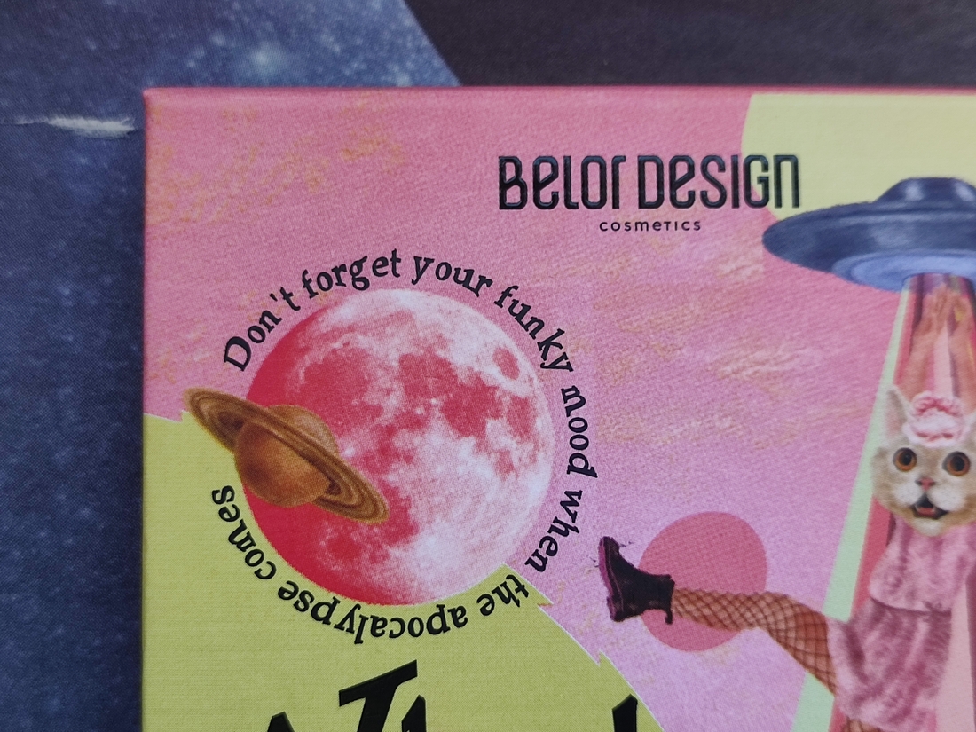 Начнем с упаковки. Она картонная, на лицевой стороне нас встречает гламурный коллаж с глазурованными надписями. Леди-кошка, пришельцы, луна и сатурн. Крышка магнитная.
