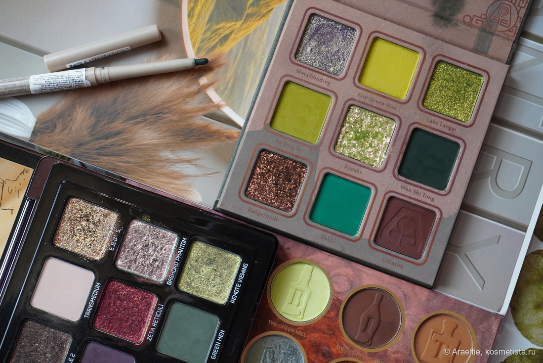 Для макияжа я выбрала три палетки теней:Lethal Cosmetics Avatar: Earth, Adept Cosmetics E.B.E.'s и Nomad Cosmetics Chicago Speakeasy, также пригодился недавно купленныйзелёный карандаш от Essence: