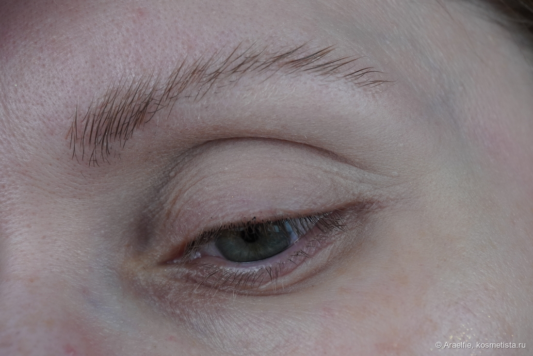 Теперь уже можно убирать осыпания, прорисовывать межресничку коричневым карандашом Shiseido и нижнюю водную линию карандашом Essence в оливковом оттенке 06 Deep Olive, этот же карандаш нанесла во внешний уголок нижнего века в стык к стрелочке: