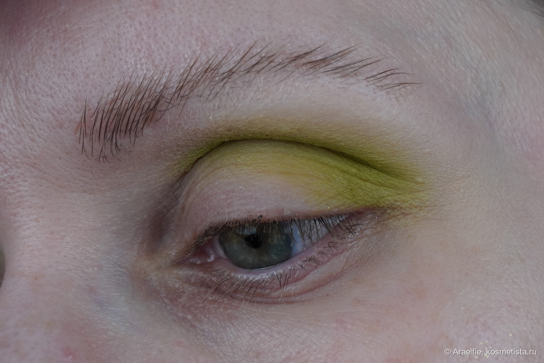 Пальцем нанесла блестящий оттенок E.B.E 1 из палетки E.B.E.'s, в самый уголок уже подлезала кистью. Это красивый золотистый дуохром с салатовым бликом, на салатовом матовом выглядит более зеленым: