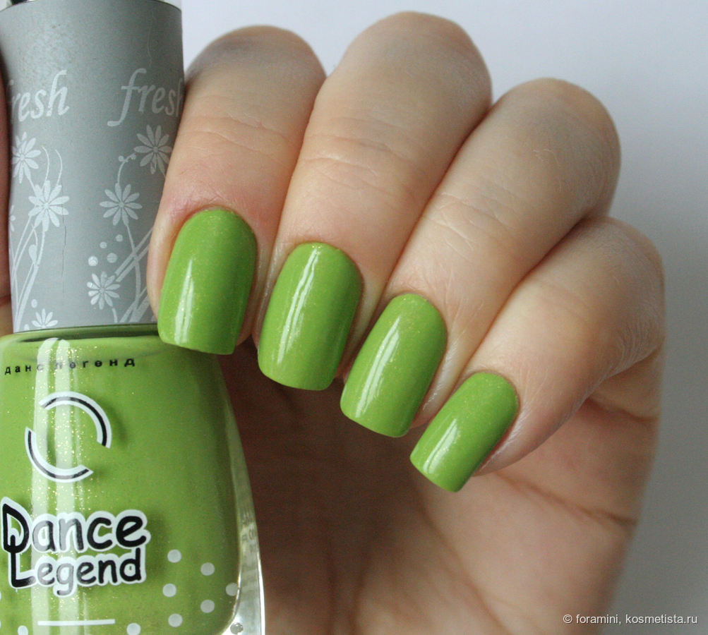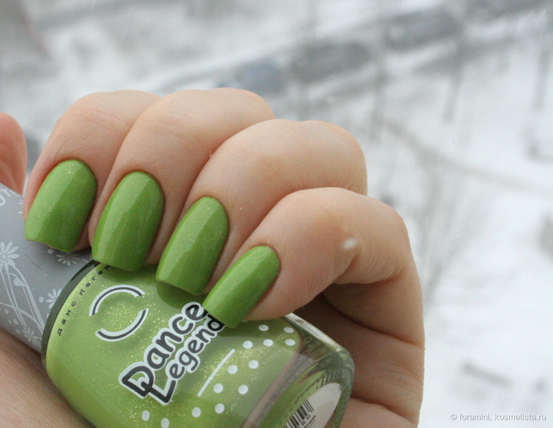 Лак имеет базу свежего зеленого оттенка. Он не неон и неядовитый, просто приятный зеленый цвет. В качестве наполнения — золотые микрохлопья. Микрохлопья практически не видно на ногтях, они не блестят, но создают едва заметную рябь.