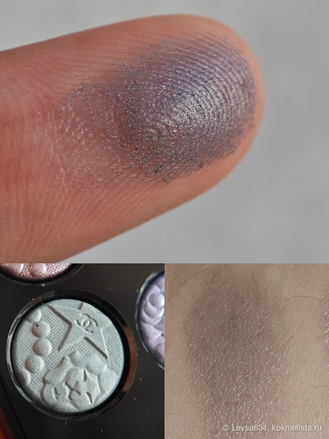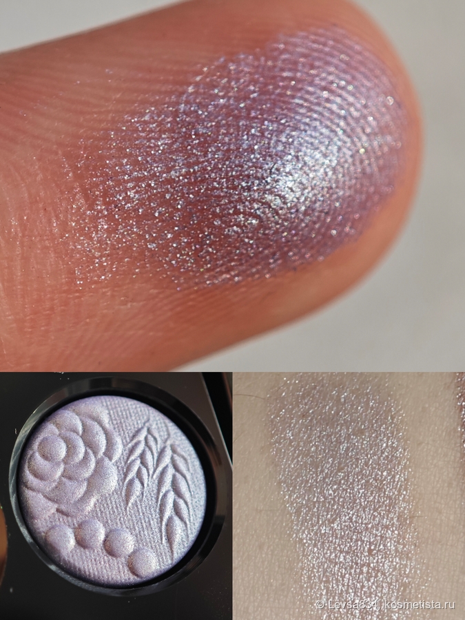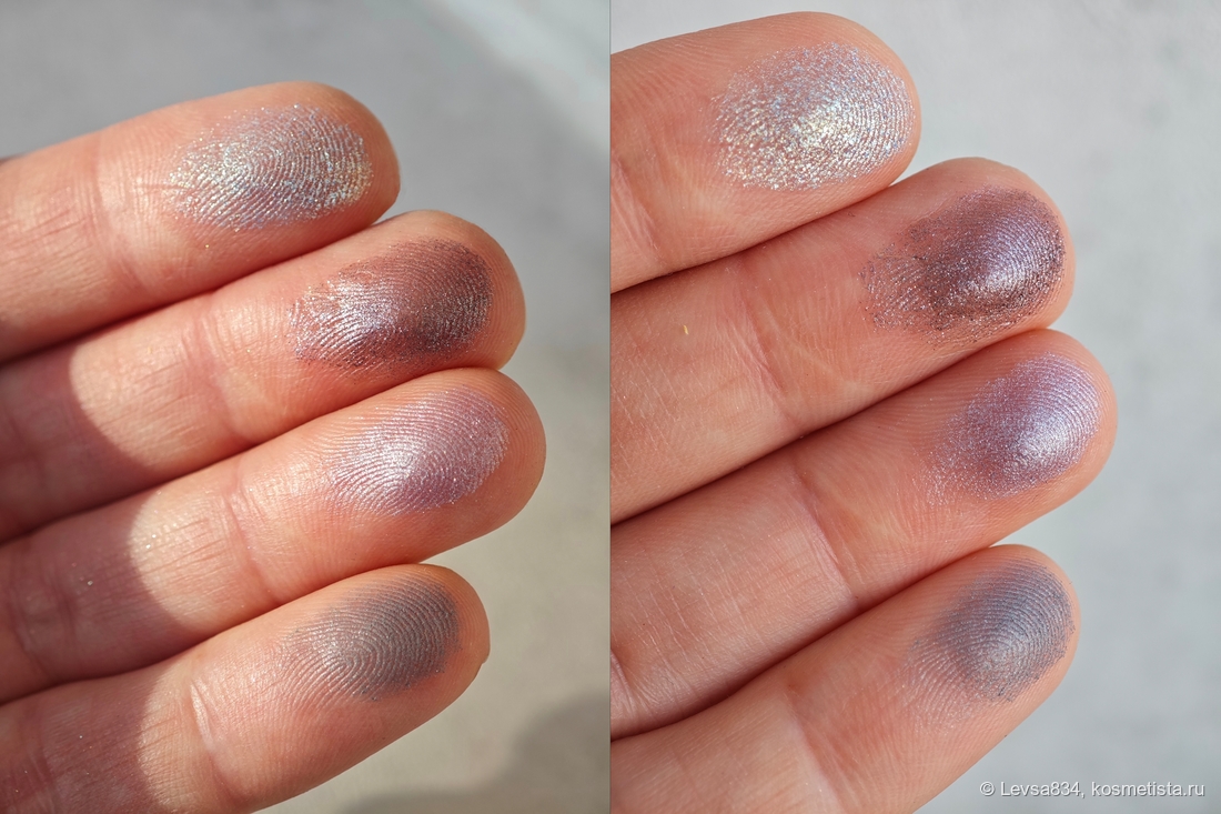 Сиреневый сатин — необычный. Я когда-то такими оттенками была загипнотизированна, искала их, покупала. Потом поняла, мне они не идут. Однако здесь, в палетке, он мне служит хайлайтером, наношу его на внутренний уголок глаза и под бровь, а ещё смягчаю им границы нанесения серого. На солнце он неожиданно раскрывается розово-лиловыми искорками, очень красиво. Наношу его кистью. Этот оттенок может немного осыпаться при нанесении, но в макияже ведёт себя безупречно, как и все остальные.