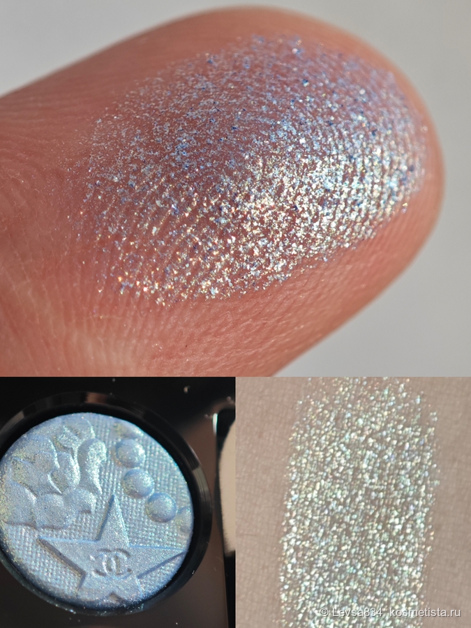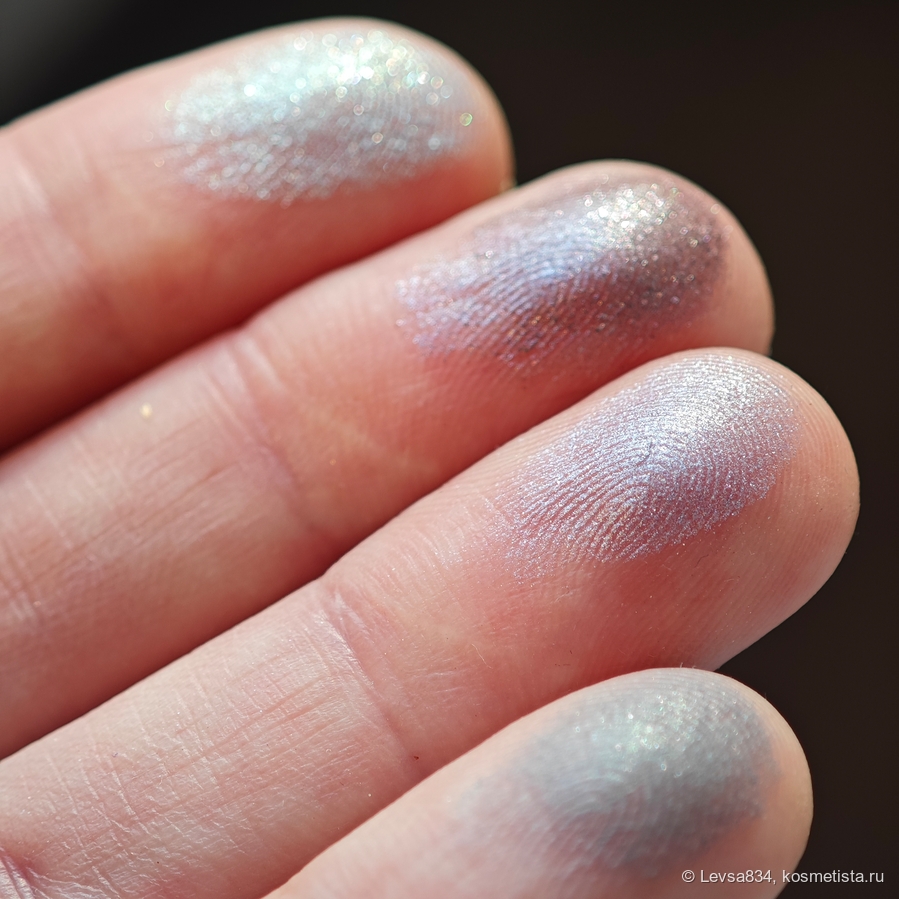 Голубой спаркл — тоже уникальный для меня оттенок, он словно молочный, в нём есть золотые блёстки. Чудесный оттенок, очень красивый. Сухой. Наношу его чаще всего пышной кистью в качестве завершающего штриха. Но и для моно макияжа он подходит, на солнце будет сверкать невероятно красиво.
