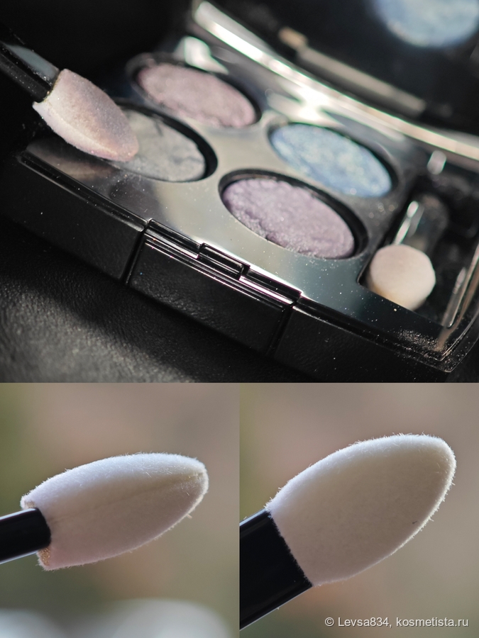 В палетке есть два аппликатора в виде спонжей — на удивление полезные инструменты. По крайней мере, для нанесения серого матового и сливового сатина. Один спонж у меня в активном пользовании, второй про запас держу.
