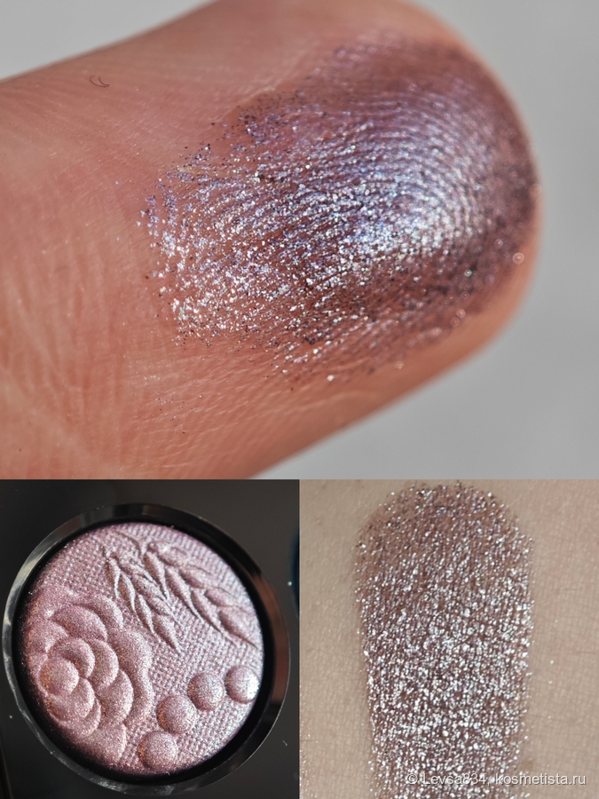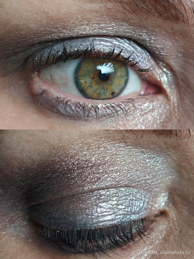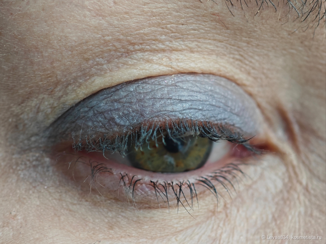 Сливовый шиммер очень хорош, второй мой любимец. В сочетании с зелёной радужкой обычно это идеальный компаньон. Да, кстати, я не упомянула сразу, хотя всё это очевидно, гамма палетки откровенно холодная, и сливовый оттенок тоже. В нём заметны серебристые отблески, поэтому в макияжах он выглядит более серым, чем в рефиле. И я всё равно его люблю. Наношу оттенок спонжем чаще, чем кистью.