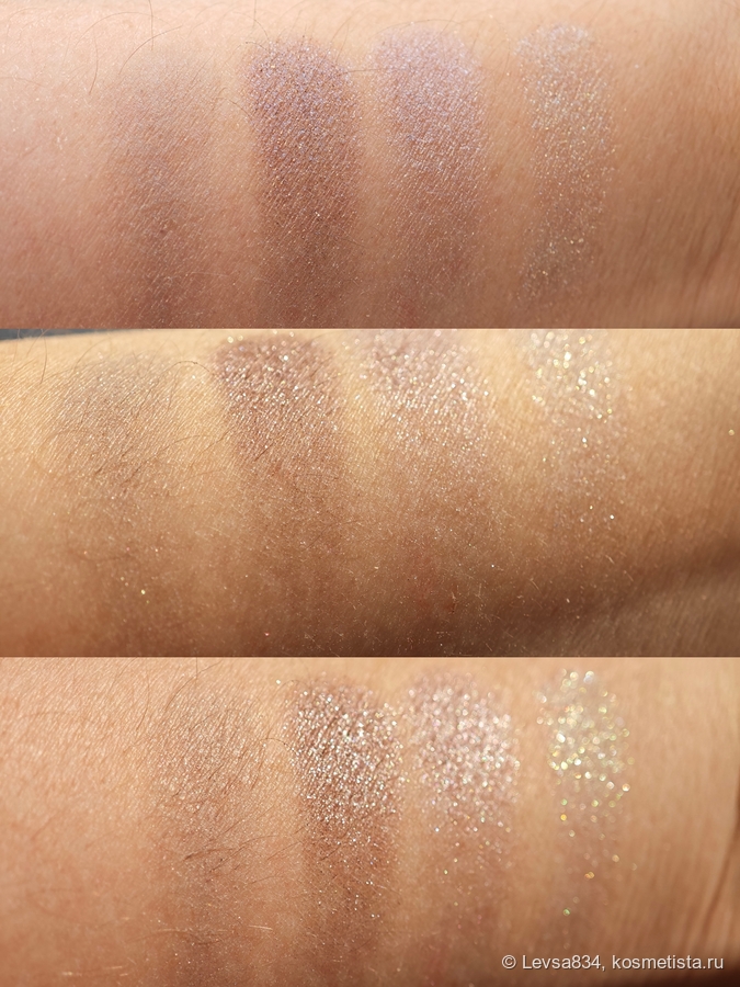В остальном же красота. Гамма нетривиальная, качество теней отличное, матовый редкого оттенка, сатины нежные и предсказуемо простые в работе, спаркл очень красивый и необычный. Покажу финиши оттенков, сделанные очень легко, тонким слоем. На глазах я советую под эти тени использовать базу.
