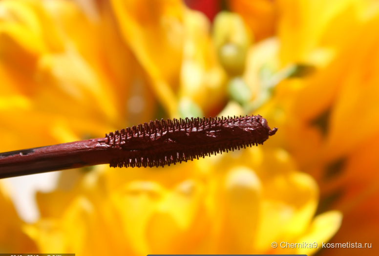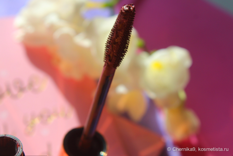 Щёточка у этой туши удобная, очень интересная, лёгкая в использовании, но сама тушь распределяется не очень хорошо из-за плохого ограничителя. Он выдаёт очень много туши, поэтому перед нанесением щёточку приходится чистить влажной салфеткой, чтобы убрать излишки.