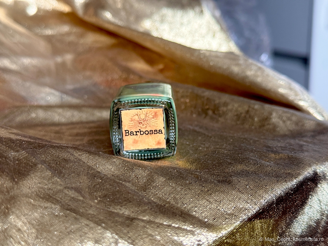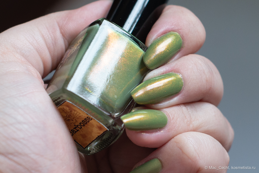 Barbossa — очень понятный и легко читаемый по ассоциациям лак: несчастный пират постоянно хотел съесть целый бушель яблок. Вот и так вышел, как яблочко: зеленое еще, не созревшее до конца, а только с наливающимся шиммером бочком.