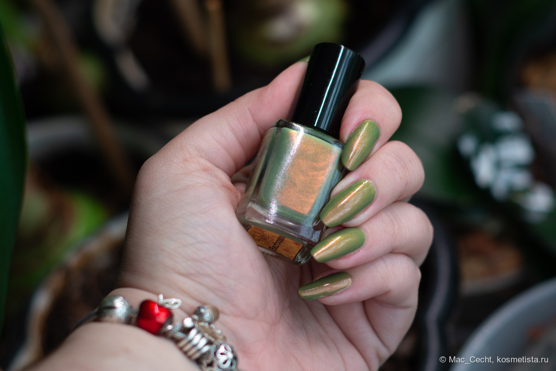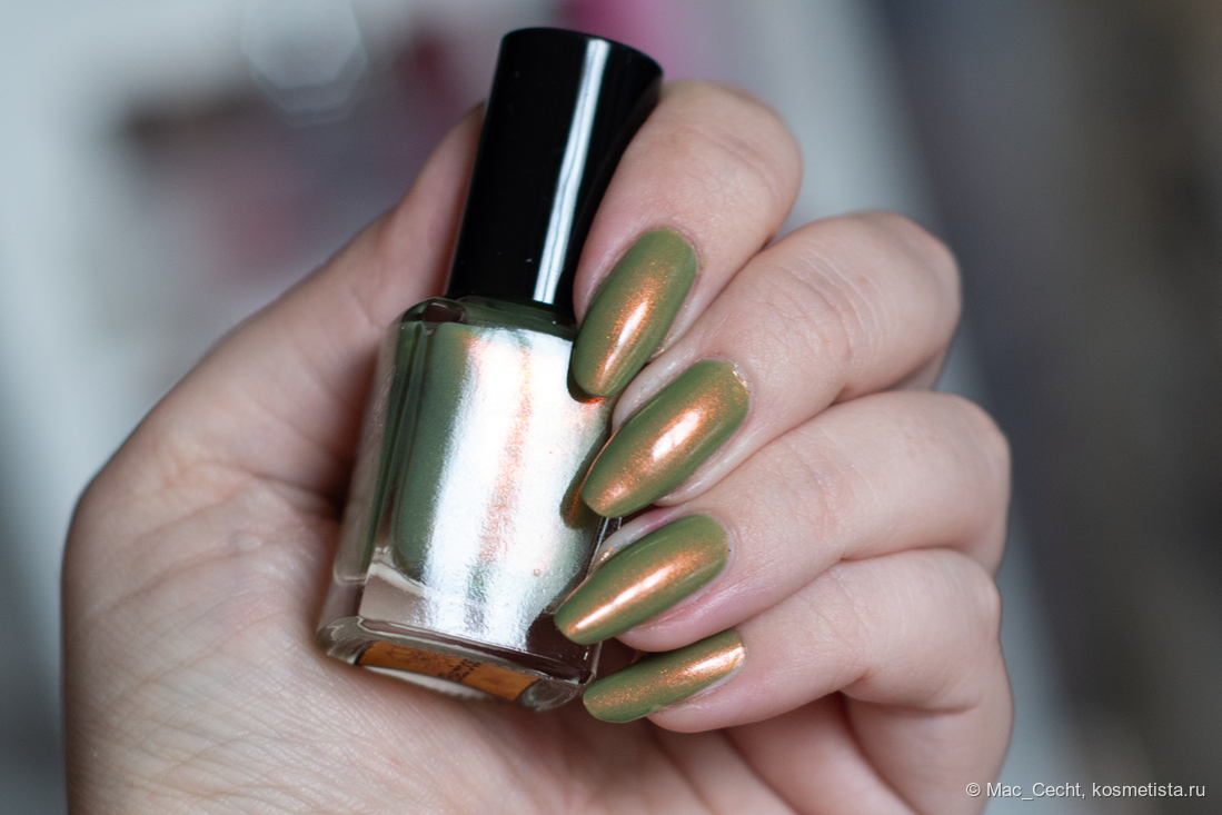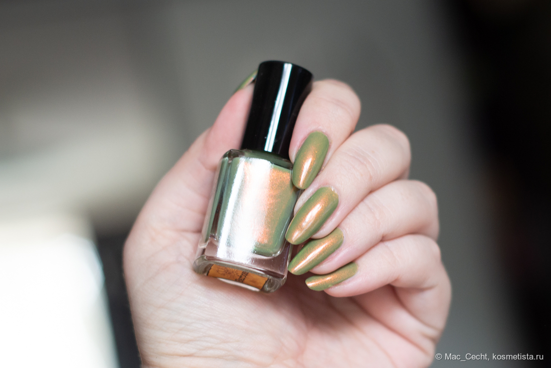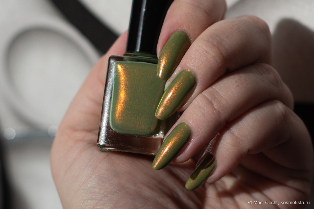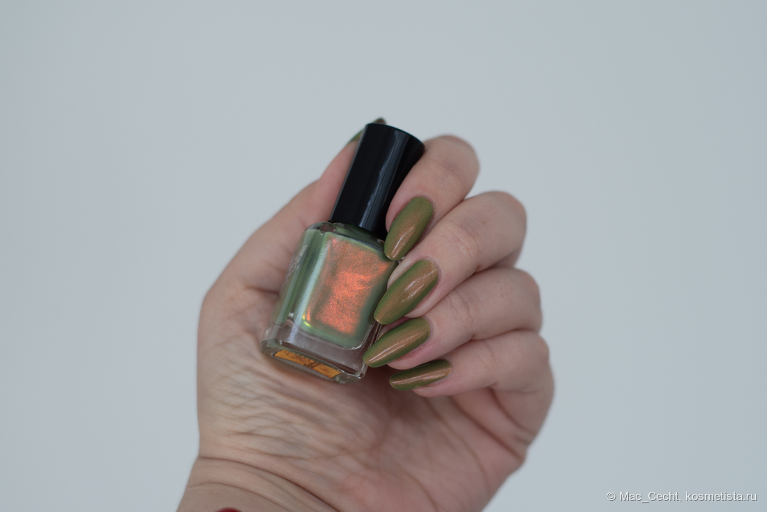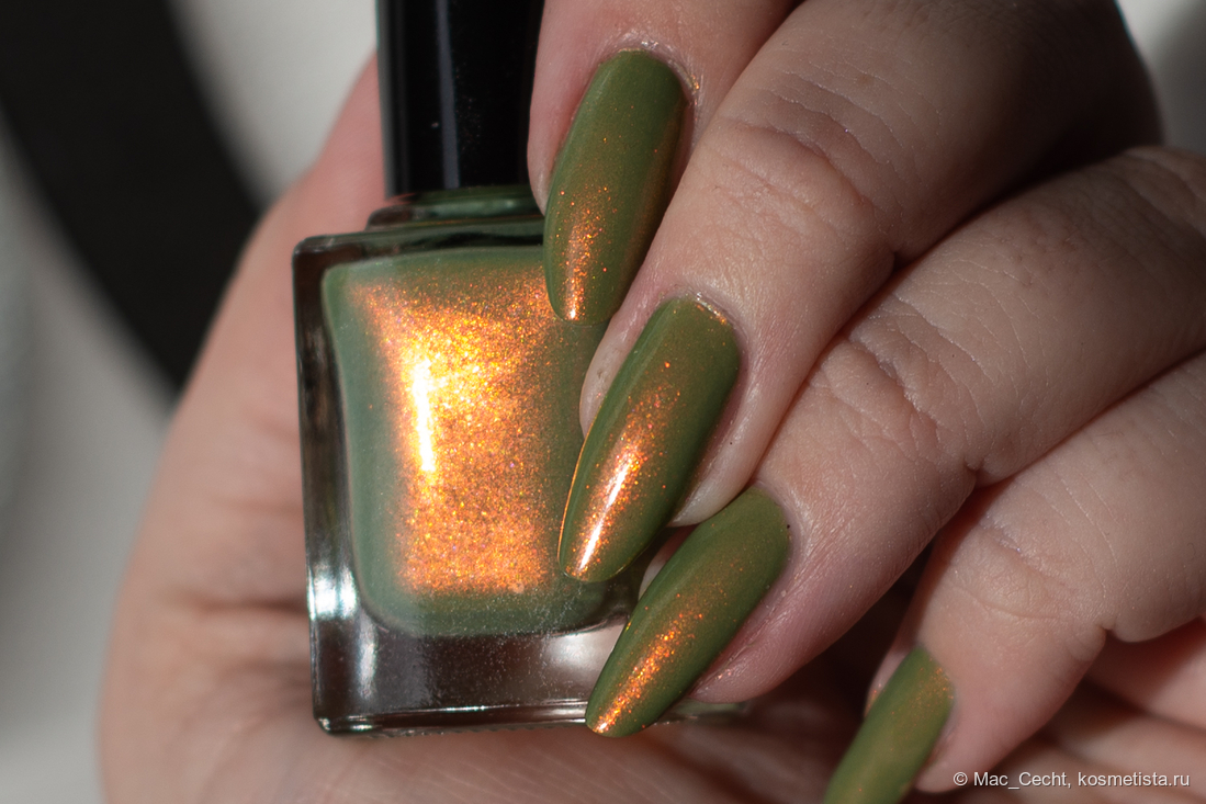 Шиммер оранжевый, мелкий. Заметен при дневном свете, дает отлив, но не всегда. На некоторых фото будет казаться даже, что лак просто зеленый, — так выглядит и в реальности.