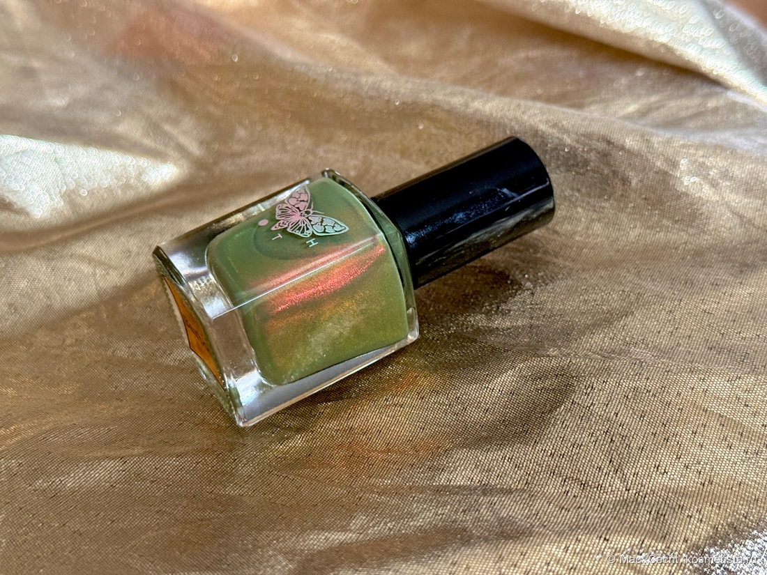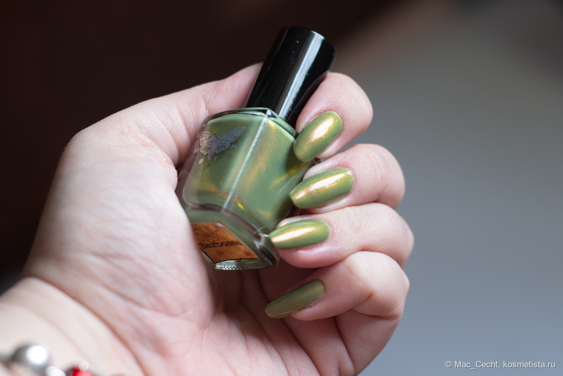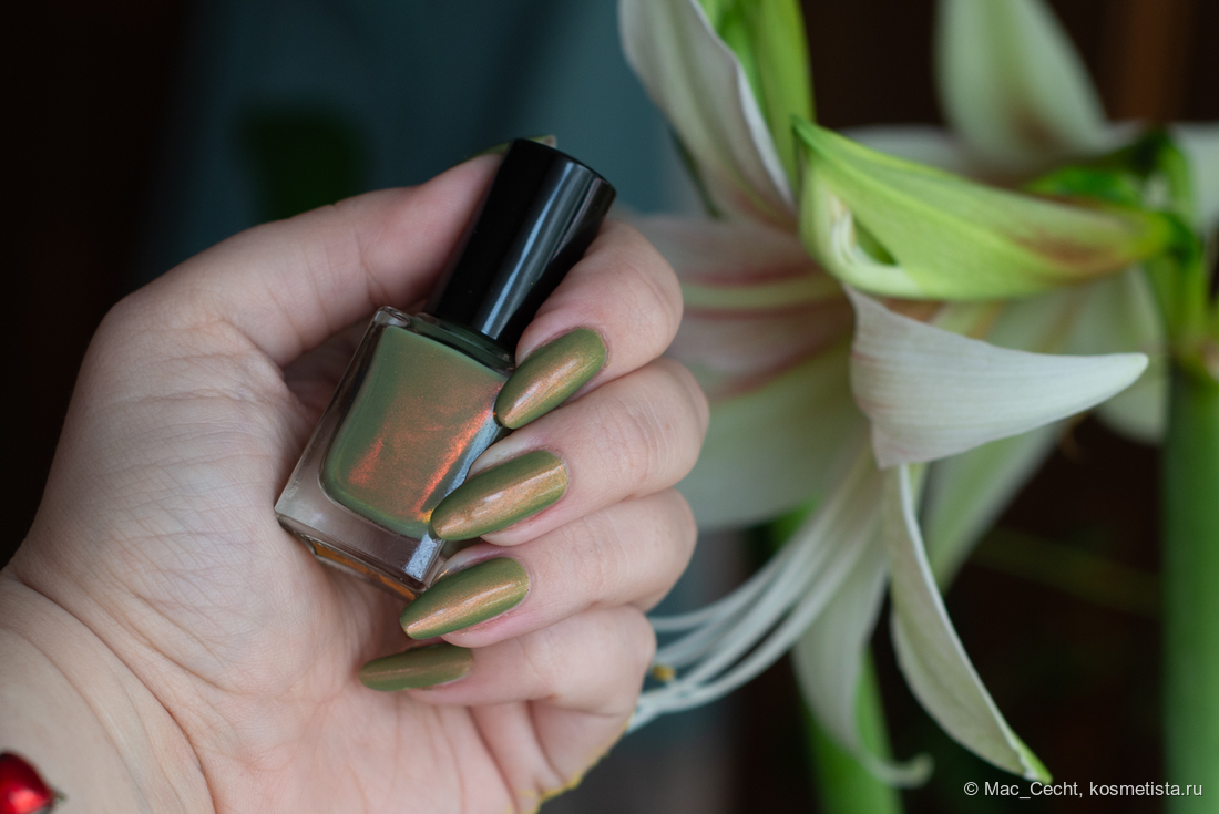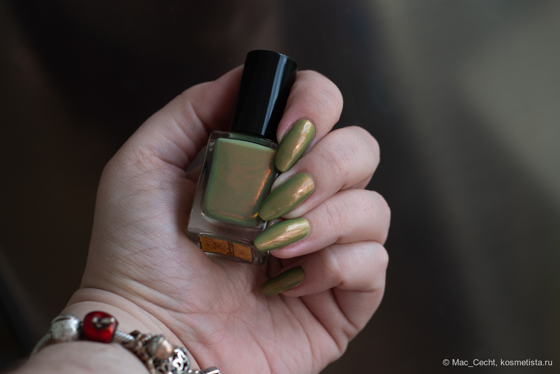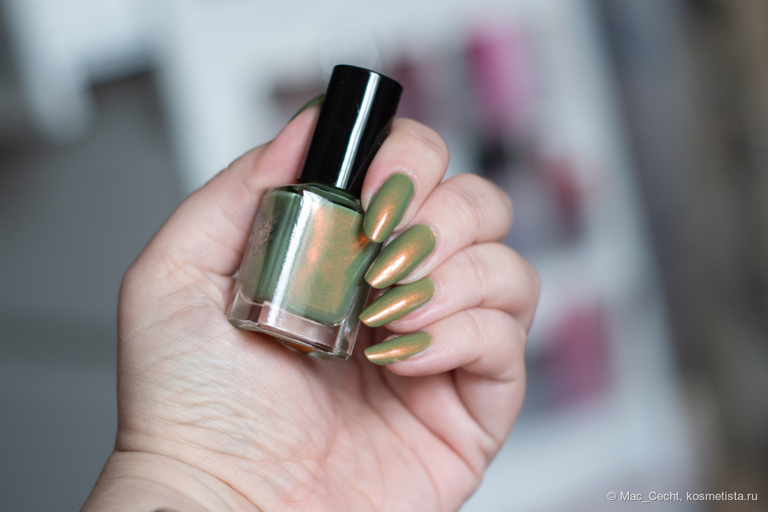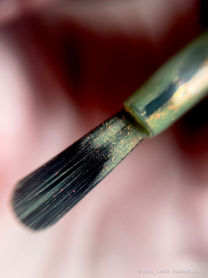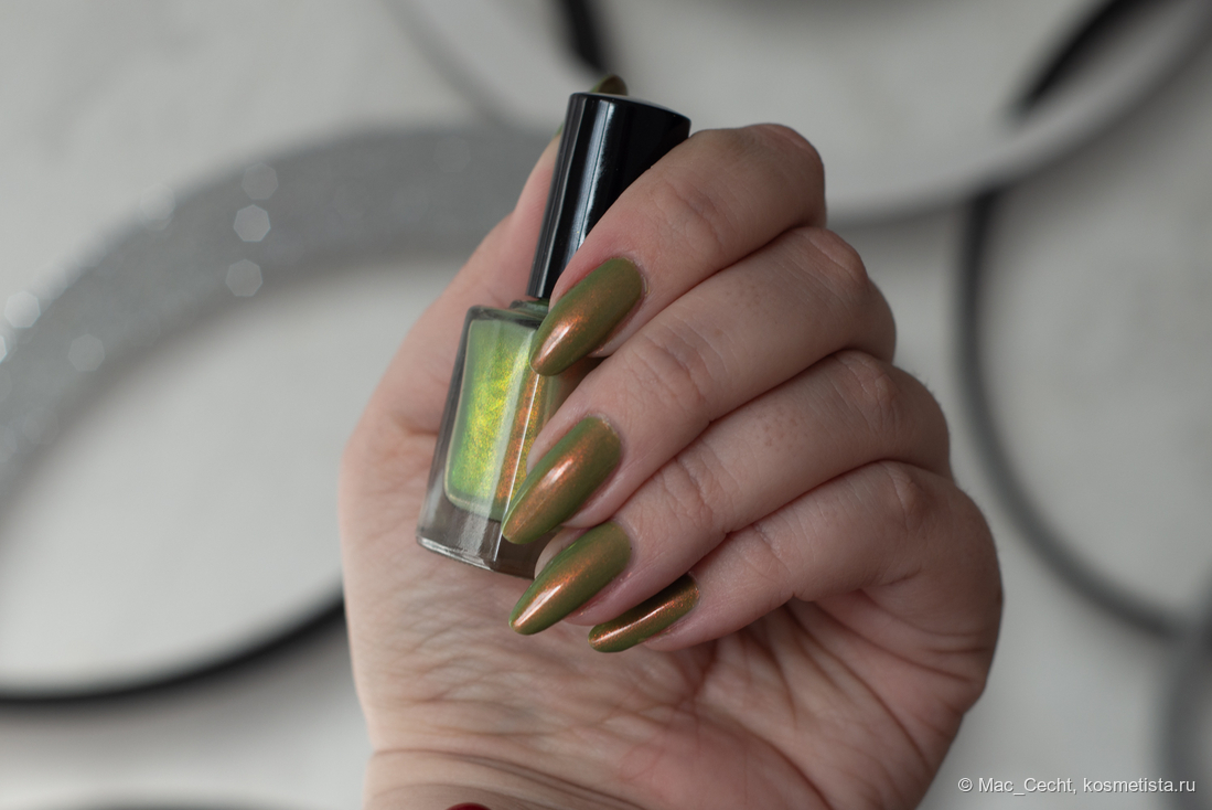 Шиммер оранжевый, мелкий. Заметен при дневном свете, дает отлив, но не всегда. На некоторых фото будет казаться даже, что лак просто зеленый, — так выглядит и в реальности.