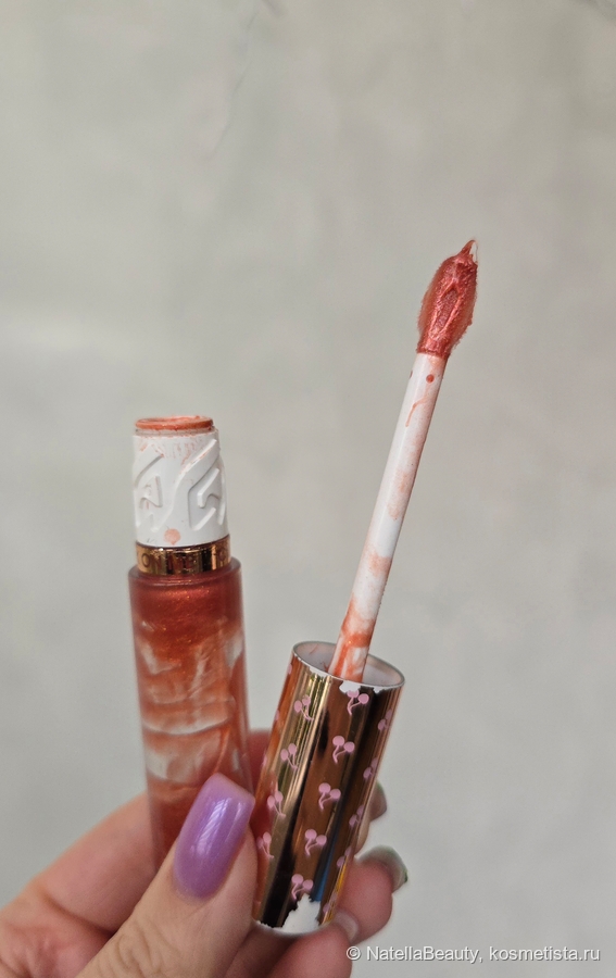 Оттенок очень красивый, но сам блеск как-то совсем ни о чем… Аромат вот пряи совсем мимо, слишком химозный. И эти стекания пигмента к контуру нижней губы прям надоели. И пользоваться им надоело. Прощаемся.