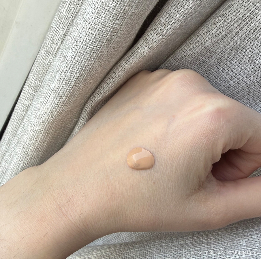Текстура крем, капля не потечет с руки. Берём кисть, смешиваем две фазы на руке и наносим на кожу.