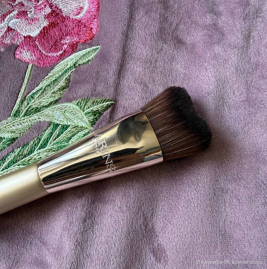 Из синтетического волокна, не колется, каждая ворсинка сужается к кончику. Не лезет при мытье (помыла уже много раз). Наносит любой тон без полос и тончайшим слоем. Я пробовала наносить и Шанель с гранулами и тинт Шисейдо и бюджетный Vibienne Sabo, и сыворотку Бобби Браун. Все одинаково идеально 😍