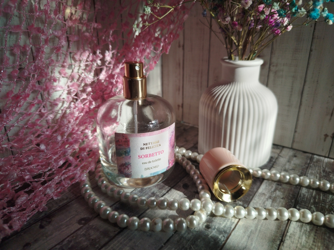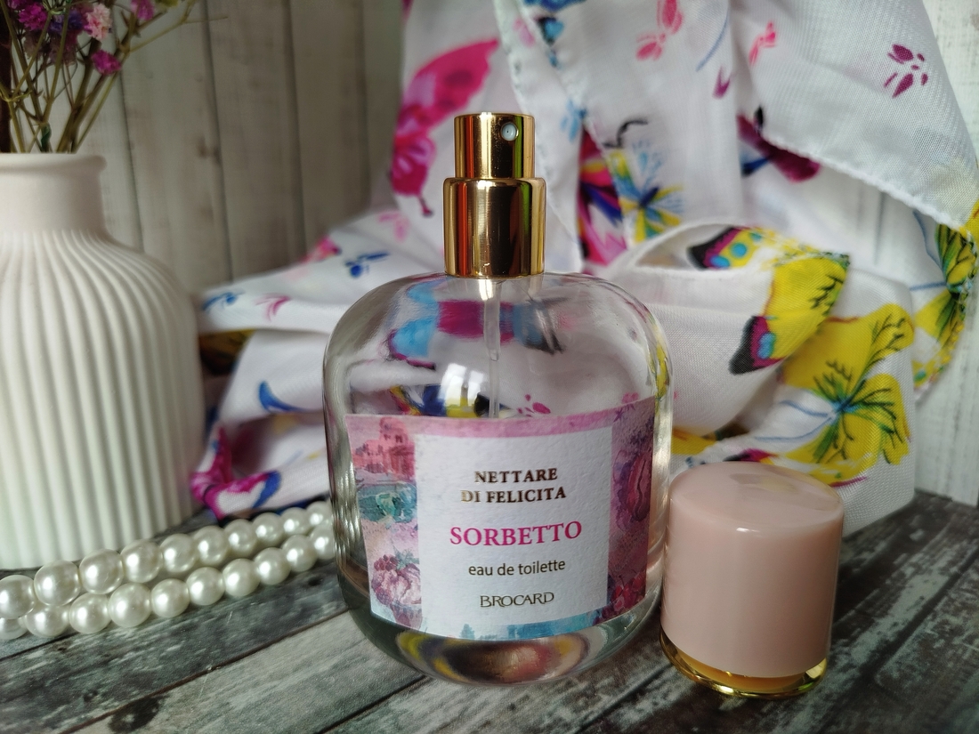 Я отношусь с уважением к парфюмерному бренду Brocard. Часто среди бюджетных ароматов этой марки можно найти достойные ароматы. Для меня одним из таких является Nettare Di Felicita Sorbetto. Многие сравнивают данный аромат с парфюмами от Escada. Но как по мне, ничего общего в звучании у них нет, кроме летнего настроения.