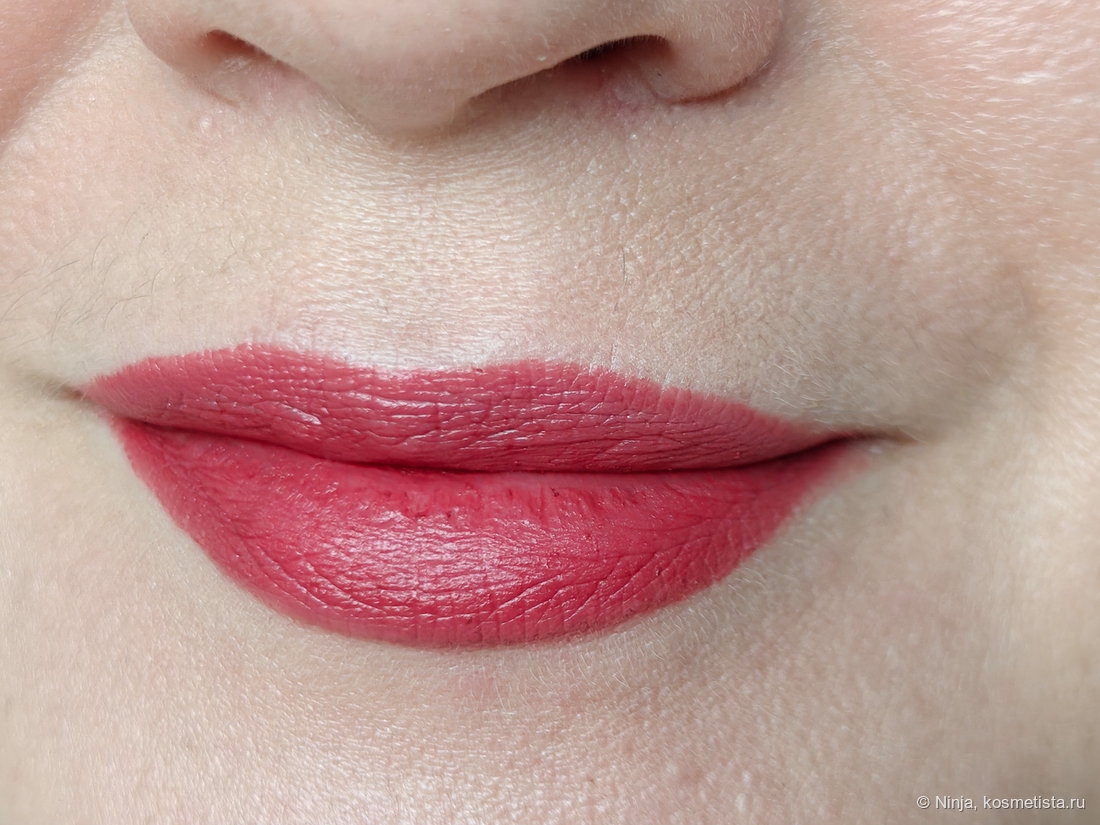 Мои губы на фото не в лучшем состоянии, но на сухие участки помада нанеслась равномерно. Пигмент не залип. Явного ухода помада не дает, но спустя время сухие участки разгладились. За это плюсик в карму.