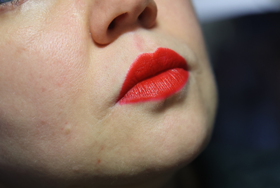 У этого оттенка лучше с контуром- проще рисовать. Это все еще не помада для макияжа на бегу, но с ней проще. Тот же запах сильно полежалой ванили — к счастью он не ощущается на губах. И матовый бархатистый финиш. Стойкость феноменальная — около 12 часов. Переживет и чаи, и нежирный обед в течение дня. Никуда не денется, чуть подсотрется в центре губ. При этом она не застывает и следы оставляет. Не сушит, но и не увлажняет. После удаления салфеткой остается тинт.