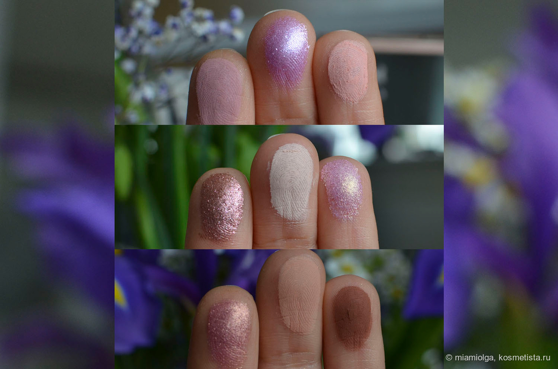 Текстуры матовых — сухие, даже слегка меловые, но они великолепно переносятся на веко и не выглядит мукой. Не осыпаются! Металлики — мягкие, сливочные. С помощью пальца их можно нанести максимально плотно. Эти оттенки нужно наносить либо вышеупомянутым пальцем, либо плоской кистью (смоченной, например, фиксатором для макияжа), тогда они не будут осыпаться. Если использовать пушистую кисть и пытаться приклеить эти блестки к веку, то осыпаний не избежать.