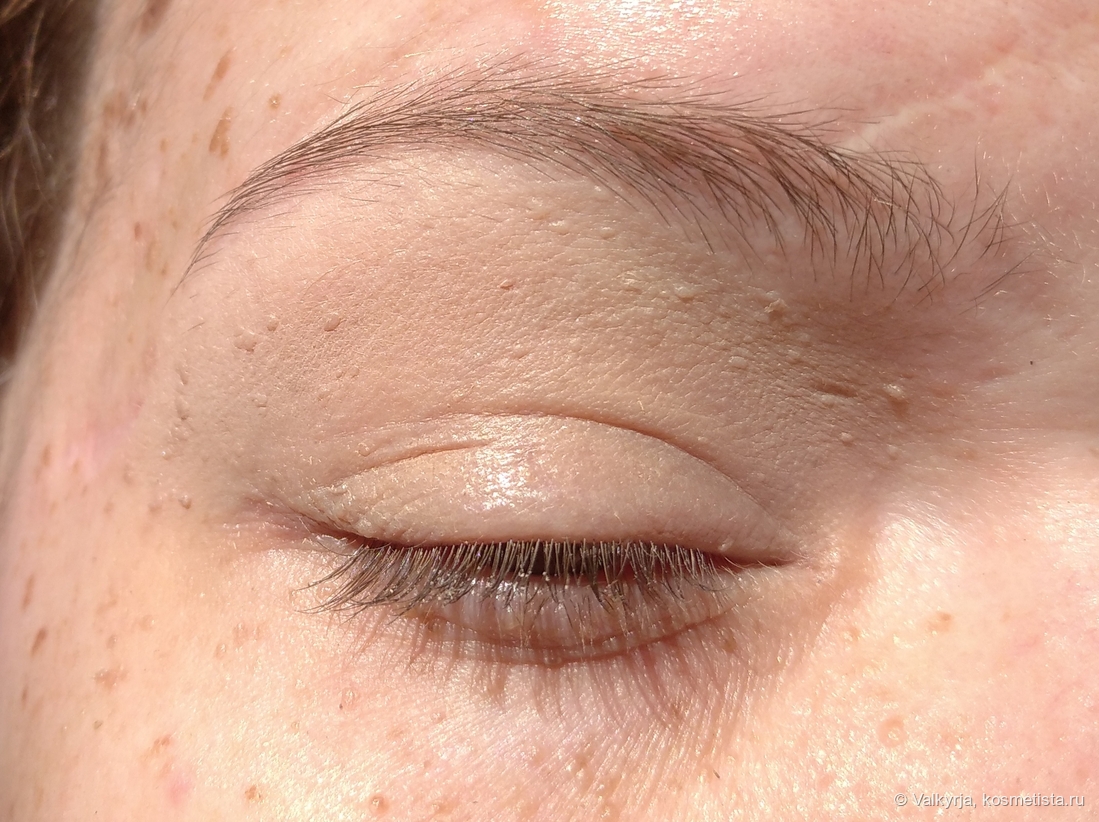 Наношу плоской, плотнонабитой кистью. Конкретно эти тени спокойно дружат и с натуральным ворсом, и и синтетикой. Этот оттенок ложится как базовый, наношу почти на всё подвижное веко, заходя чуть выше складки.