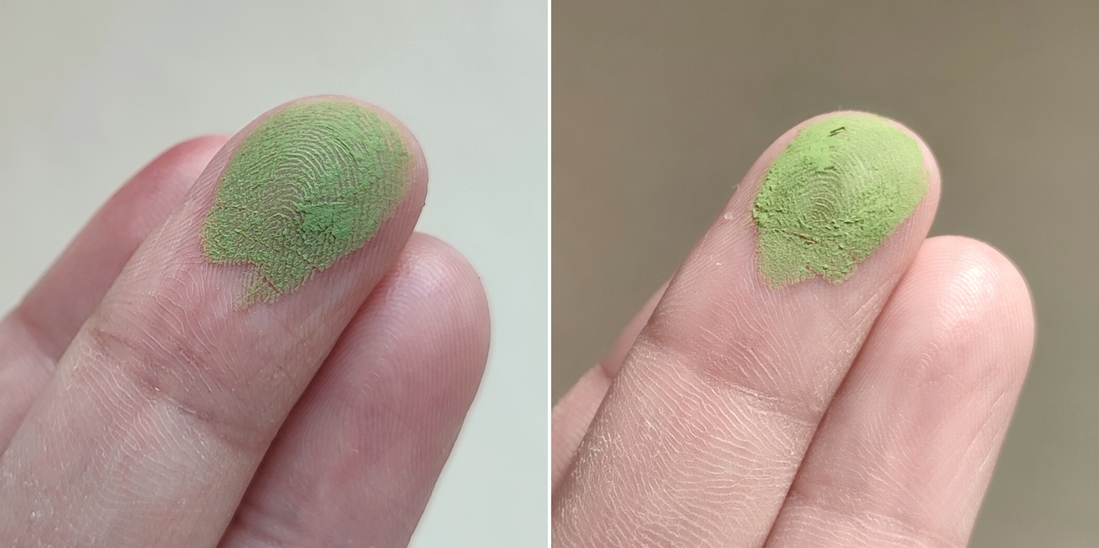 Текстура нежная, шелковистая. При наборе кистью и пальцем очень сильно пылит.