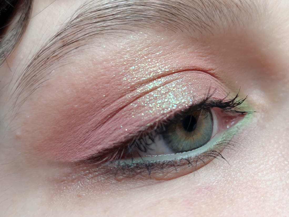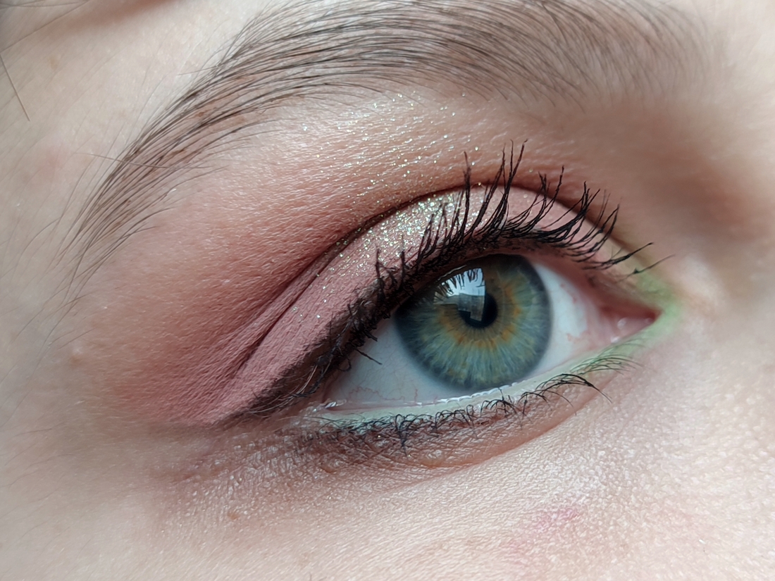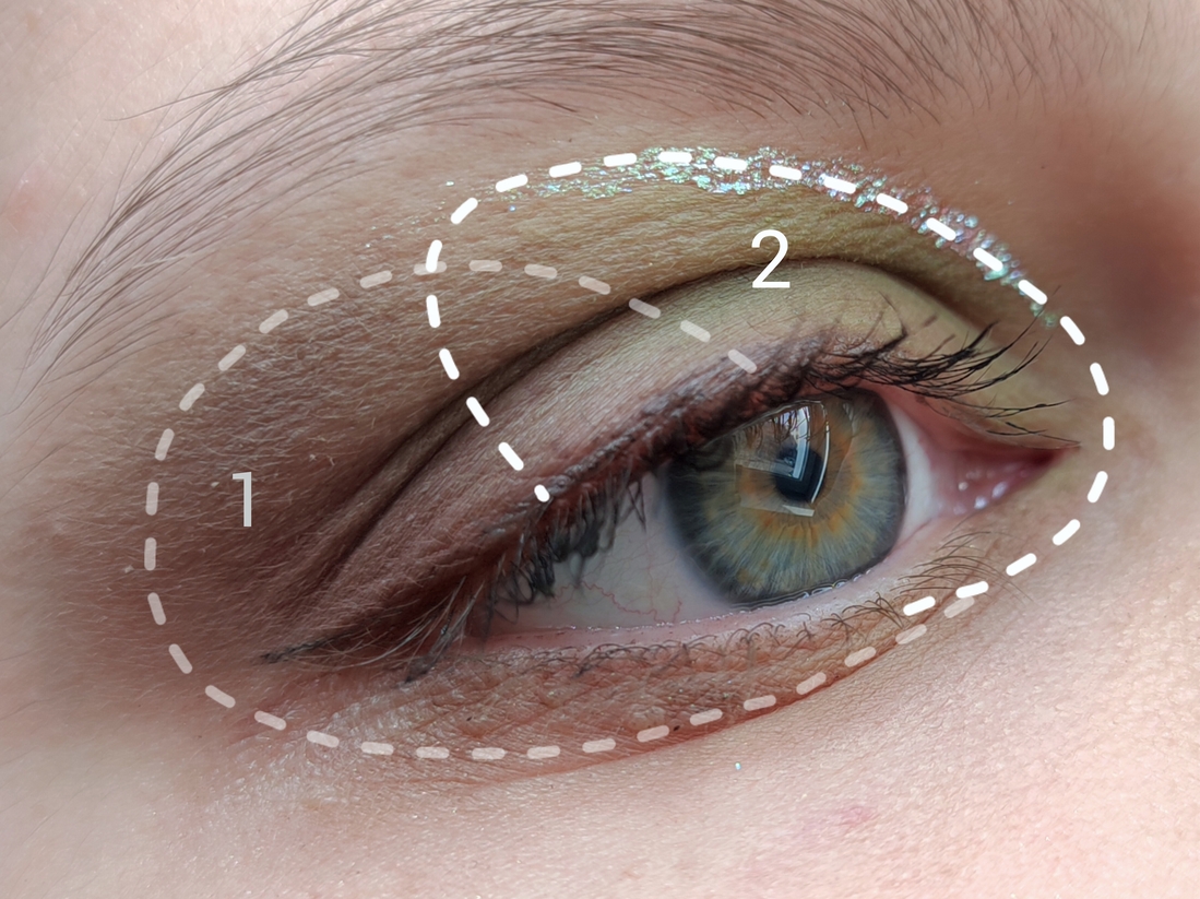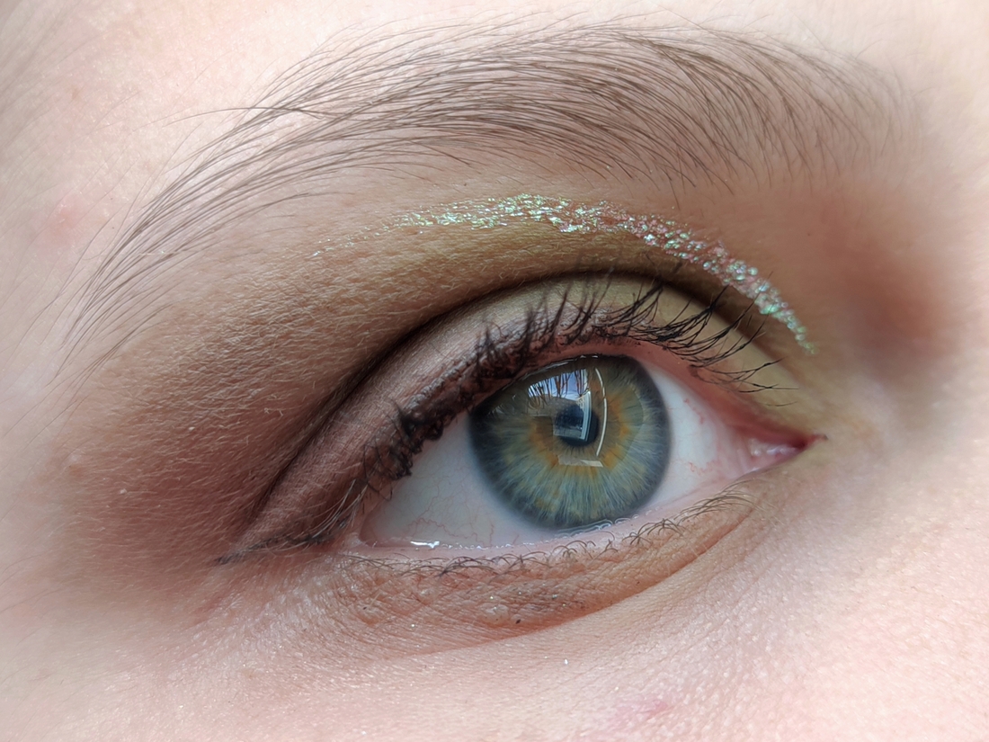 Х-спаркл на кремовых тенях, М-тень во внутреннем уголке глаза.