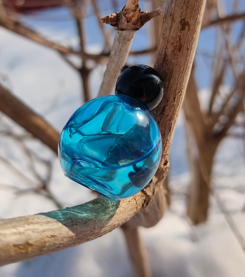 Миленький маленький флакончик голубого цвета, с черной крышкой.