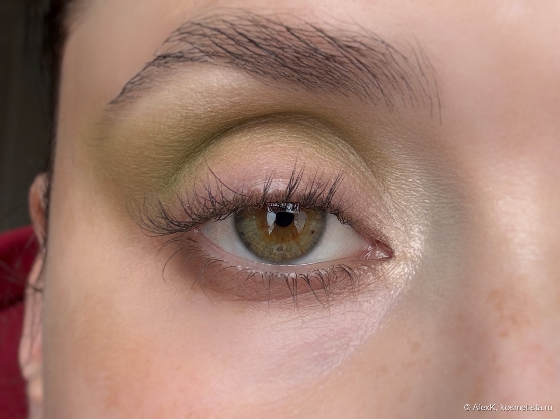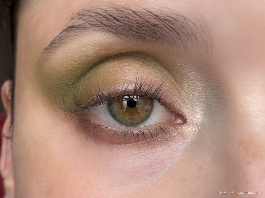 Прорабатываю складку светло-болотным Аномалия. На нижнее веко наношу нейтральный беж — Замшевую фаворитку. И стушевываю два оттенка во внешнем уголке.